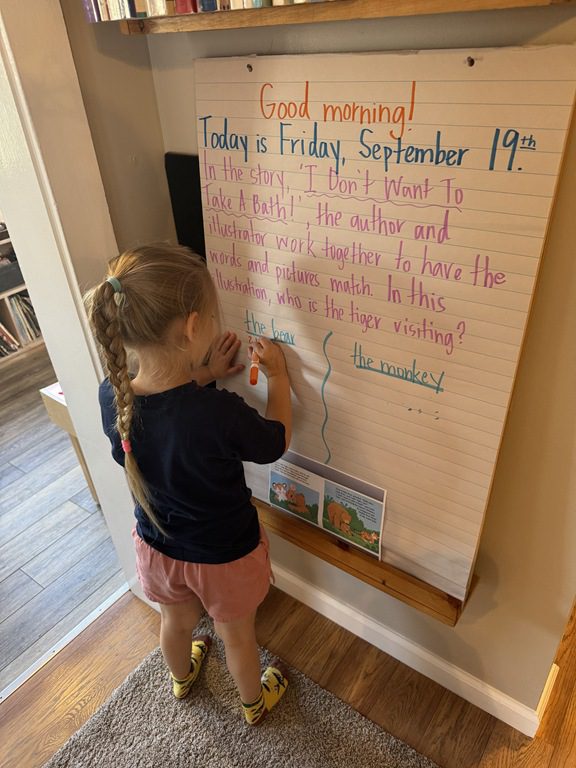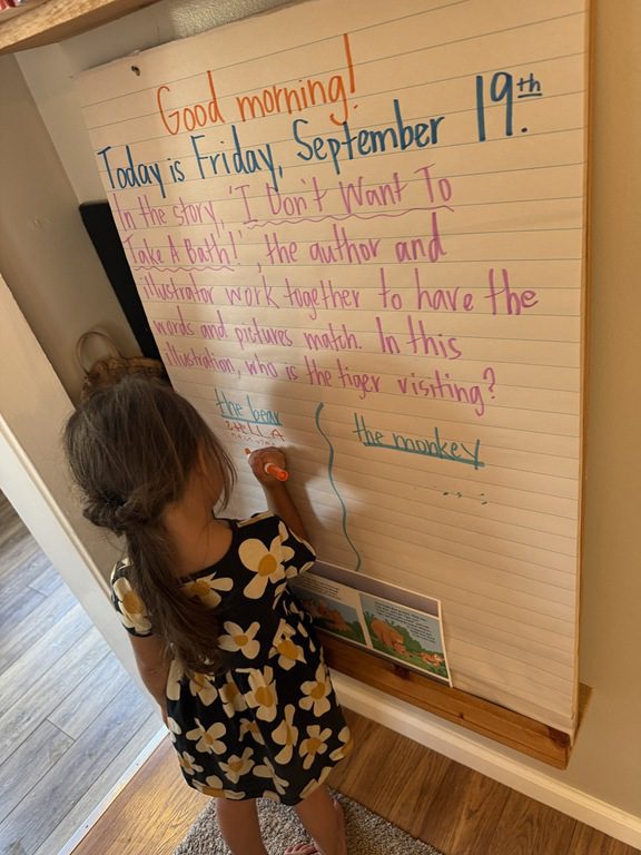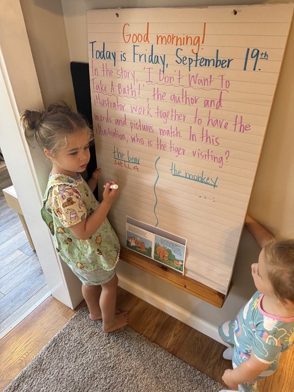 We wrapped up our week talking about authors and illustrators and how they work together. I took an illustration out of the story for our PREK1 sign in, ‘I Don’t Want To Take A Bath!’. We read the book later on in group. Throughout the story, Little Tiger visited several animal friends to try to get away from taking a bath. Throughout his adventure, he gets even more dirty! We talked about how each illustration matches the authors words. Once we understood this, we looked at the illustration to see if we could see what the authors words might say!