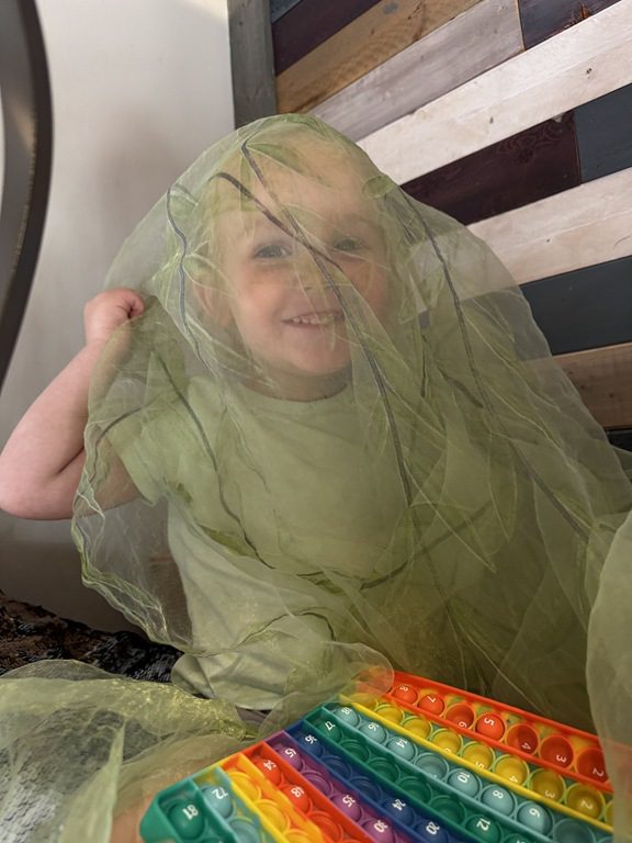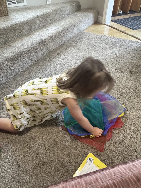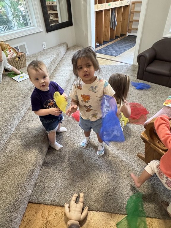 We engaged in dancing with the silk scarves to Shake Your Sillies Out.
