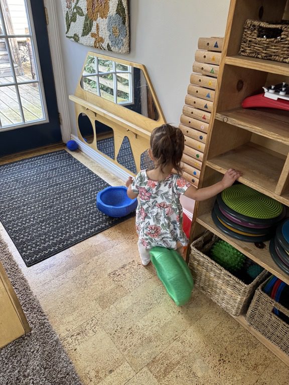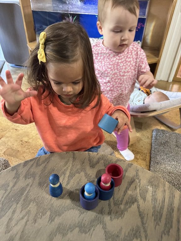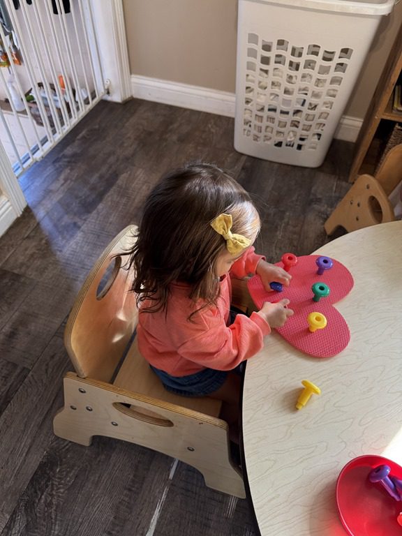 This morning we engaged with our pegs and peg boards in the kitchen.  We worked on filling our peg boards with pegs and those of us who knew the colors identified them as they put them in their boards.