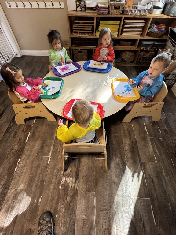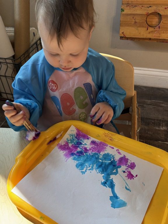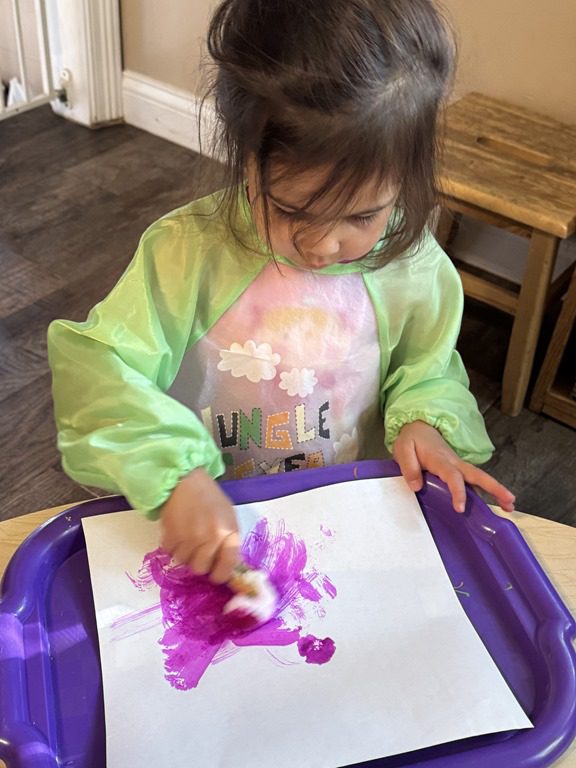 This morning we engaged in painting with cotton balls and blue, magenta and yellow watercolors.  The friends created bright colorful paintings.