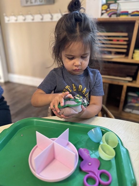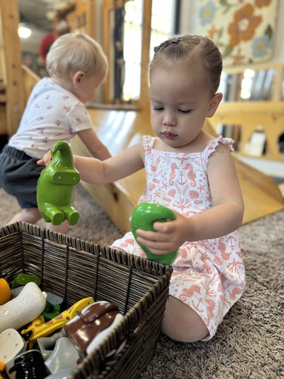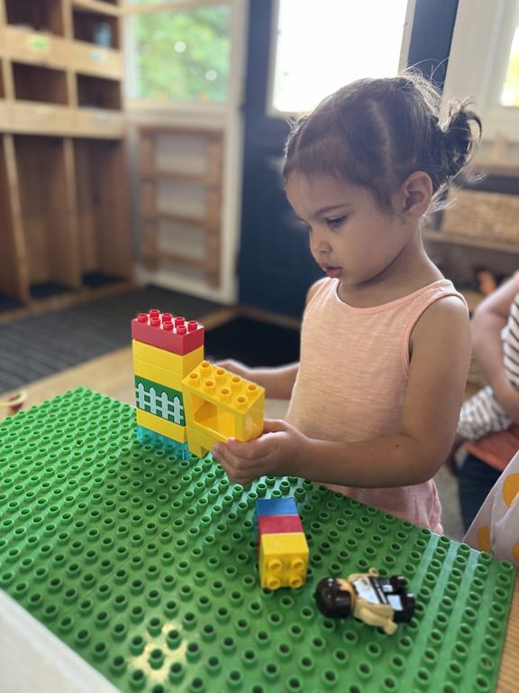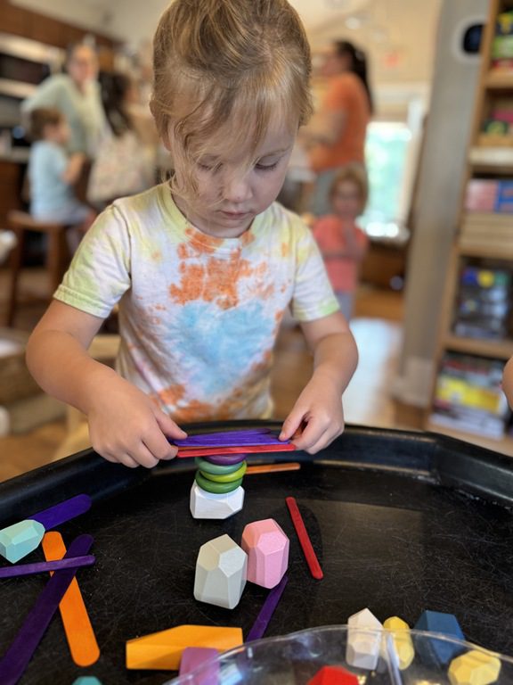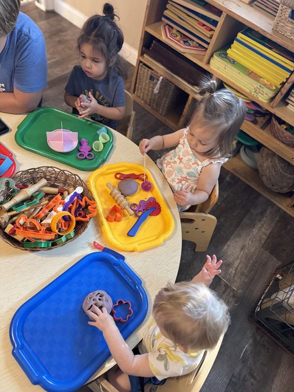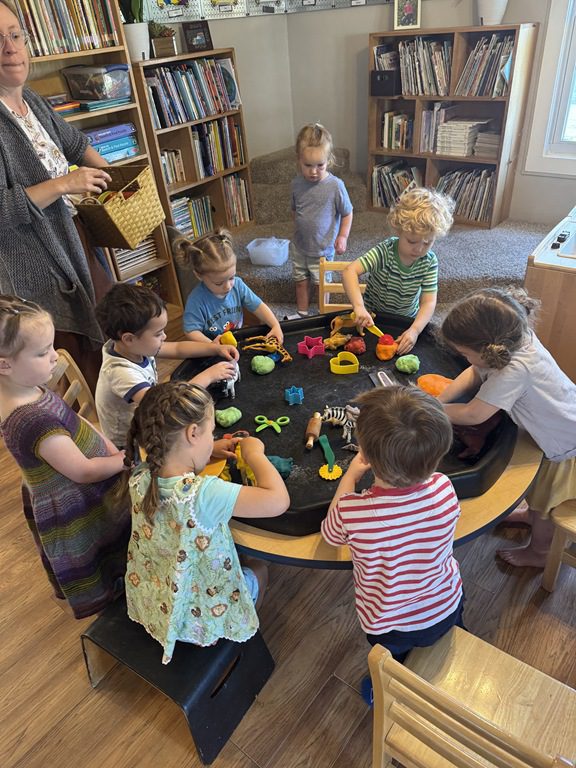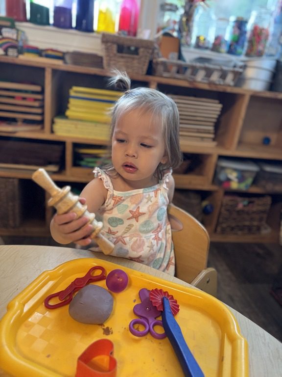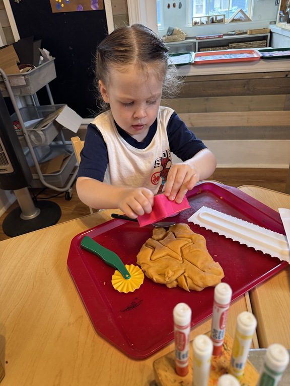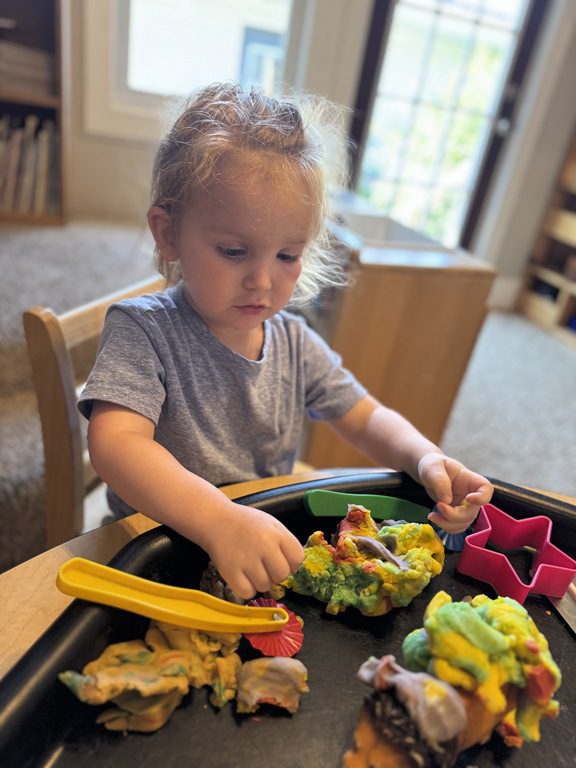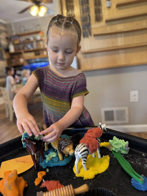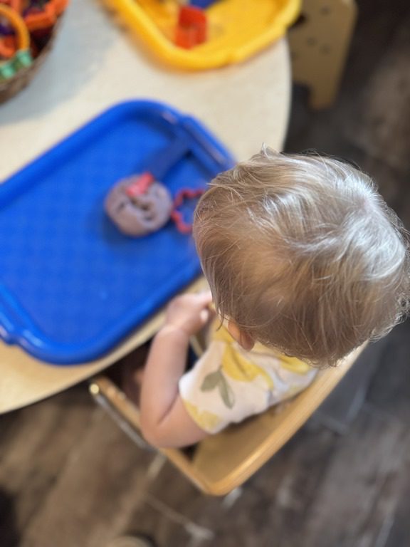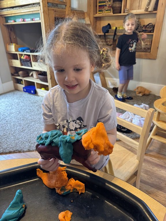 This morning we explored play dough of all colors. Friends have really been enjoying play dough this week so we decided to take it to the next level and offer it in imaginative play. One friend had the idea of using the play dough to decorate the animals as “carousel animals”. Several other friends joined in the imaginative play and got creative with building their own carousel animal. It was a great example of older friends teaching younger friends and introducing a more cooperative imaginative play atmosphere to emulate.