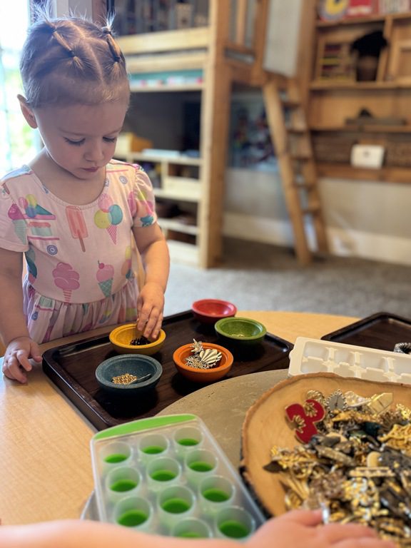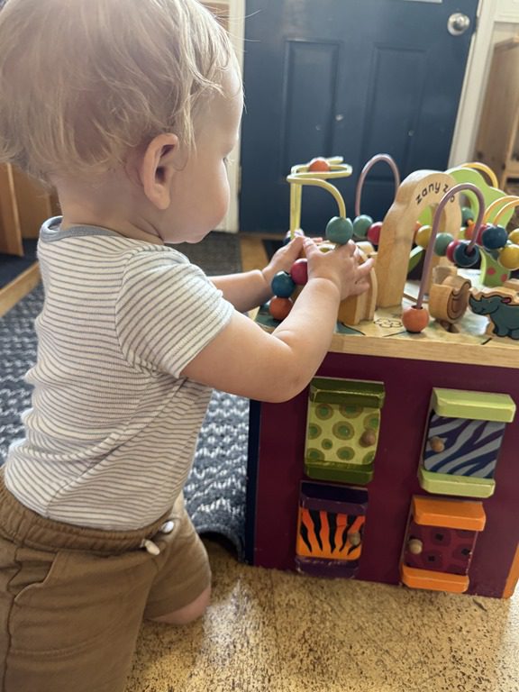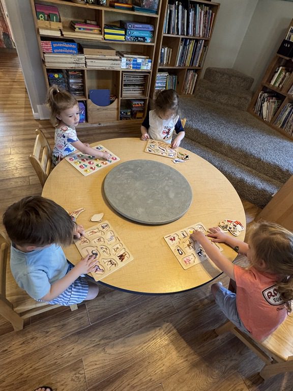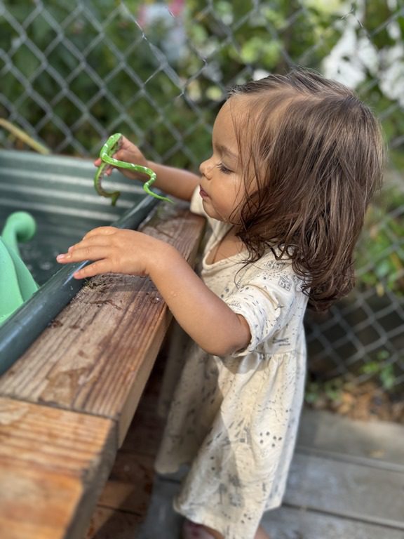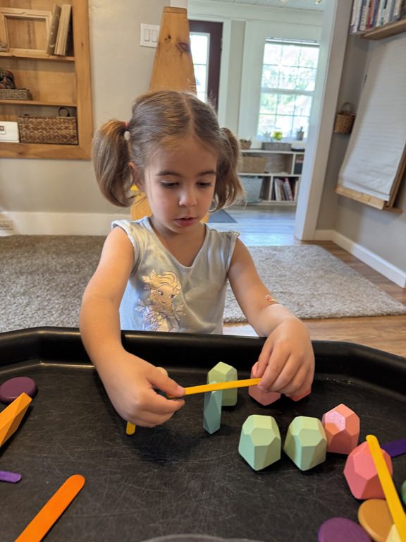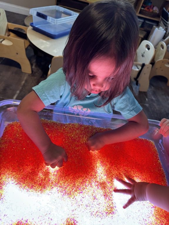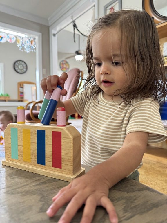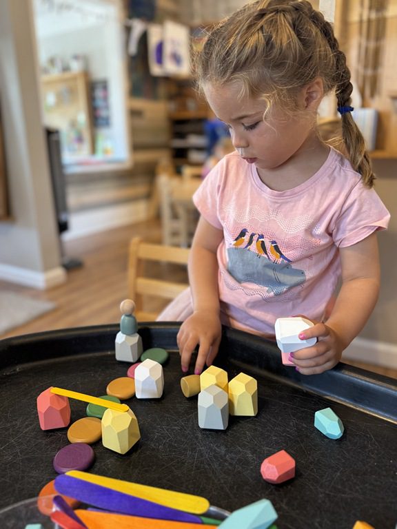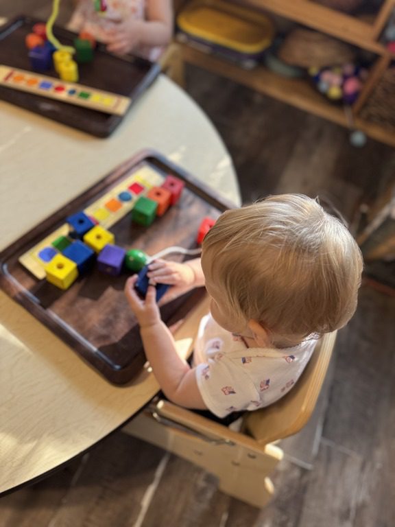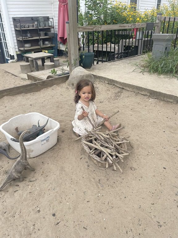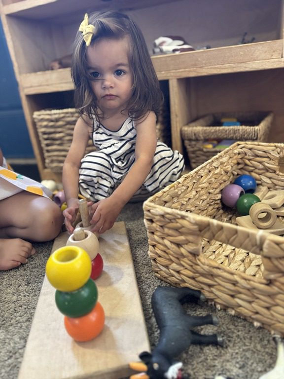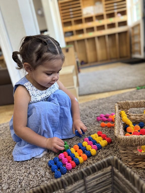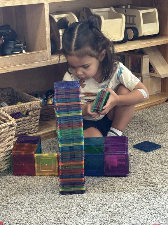 This morning we explored play dough of all colors. Friends have really been enjoying play dough this week so we decided to take it to the next level and offer it in imaginative play. One friend had the idea of using the play dough to decorate the animals as “carousel animals”. Several other friends joined in the imaginative play and got creative with building their own carousel animal. It was a great example of older friends teaching younger friends and introducing a more cooperative imaginative play atmosphere to emulate.