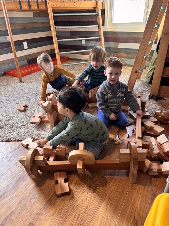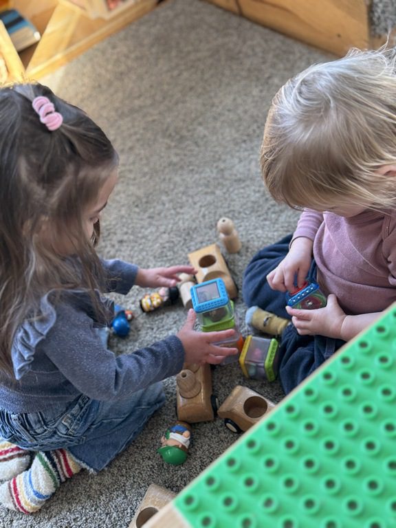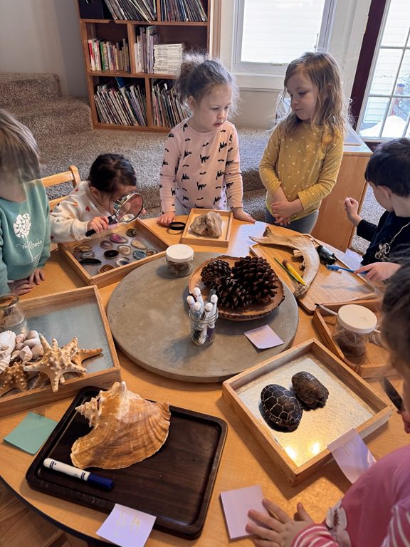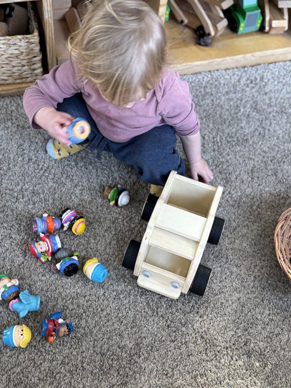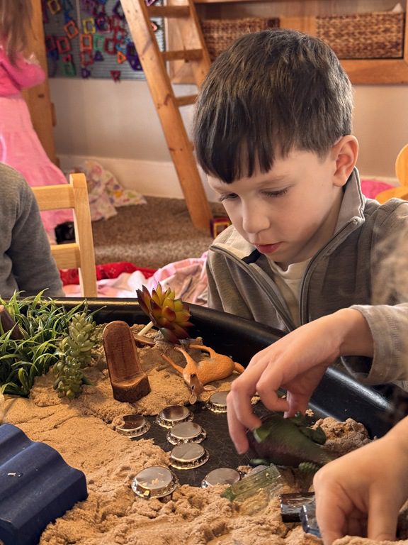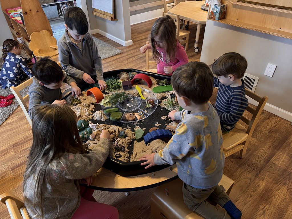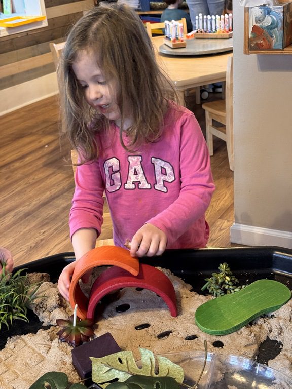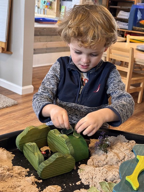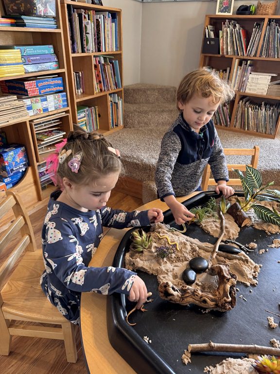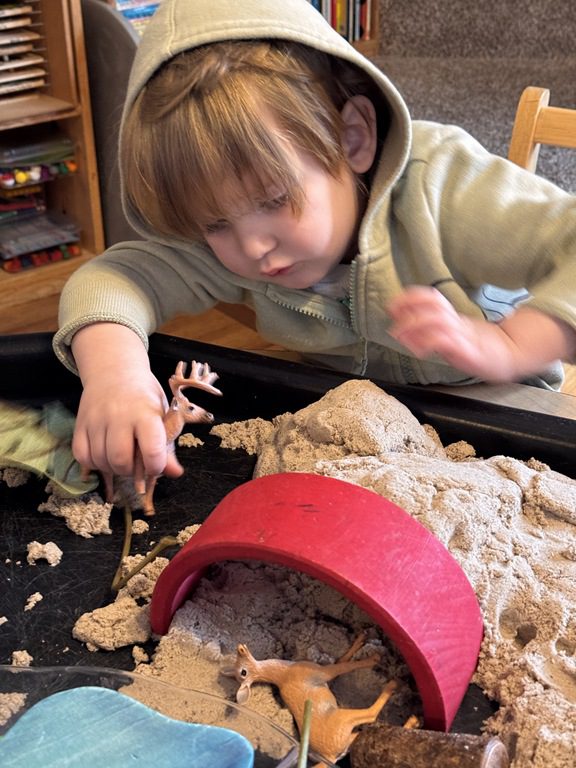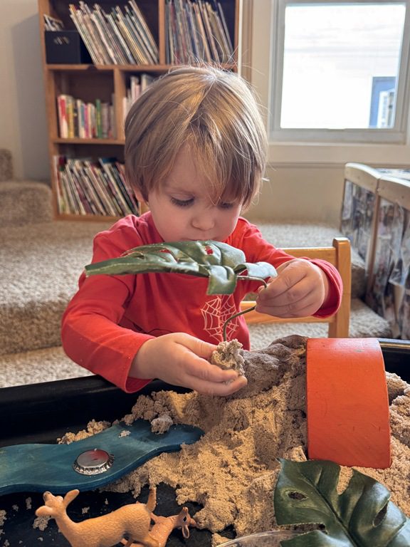 We had a discussion about “imagination” this morning and how we can use it to create play spaces and story lines. We offered an “imagination table” today with a variety of loose parts to see if we could create imaginative places and stories with our play. Everything added was in the category of “loose parts” which means they are open ended without a specific purpose. This entices kids to use their imaginations in order to decide what the objects will become and how they will use them in play. This kind on imaginative play leads to creative thinking and social development.