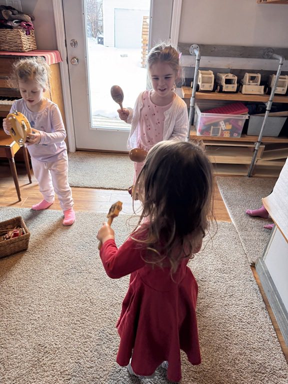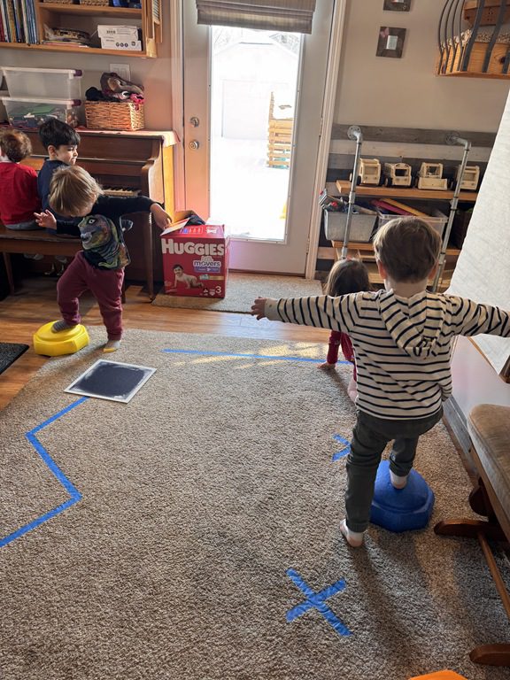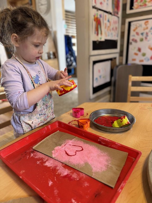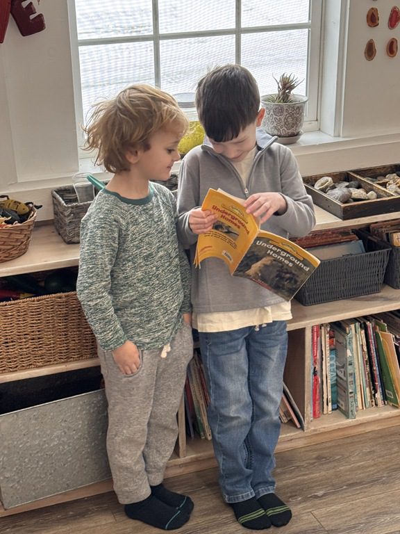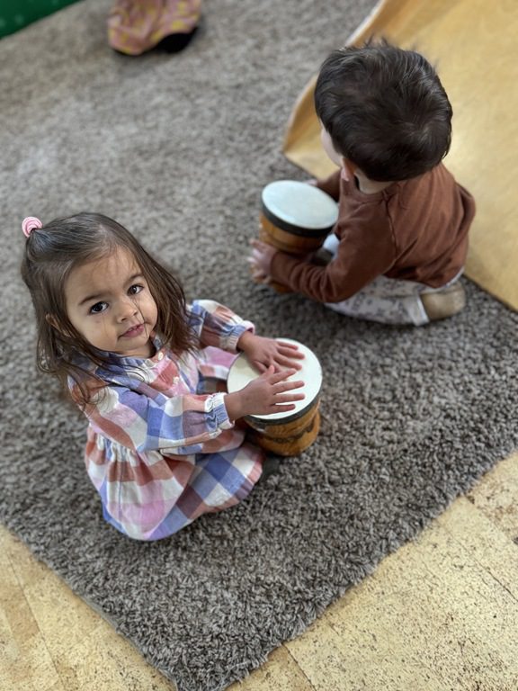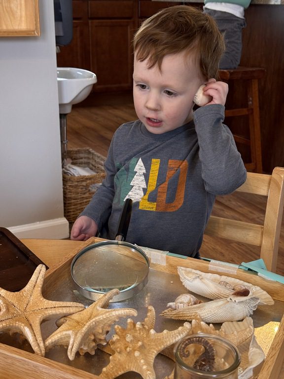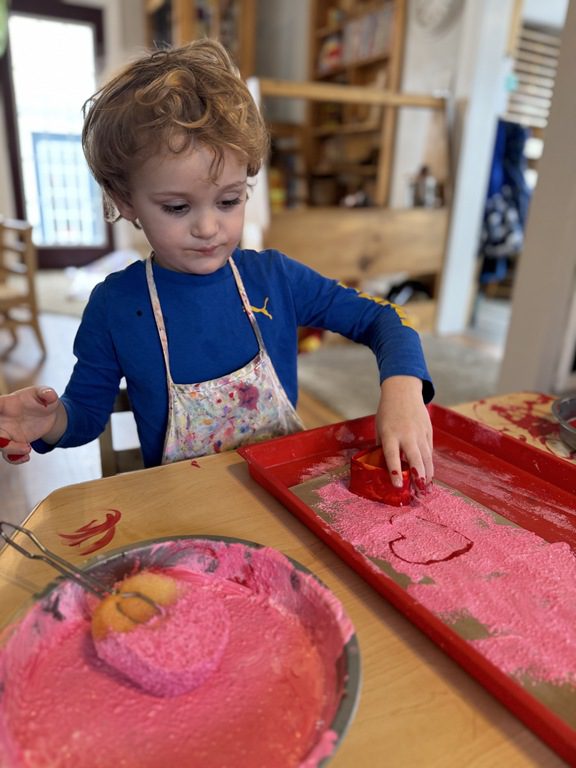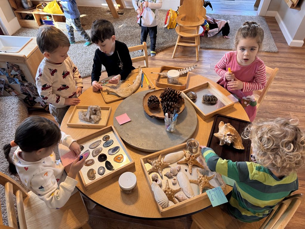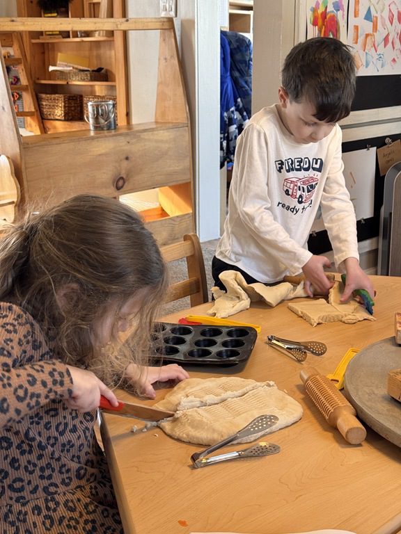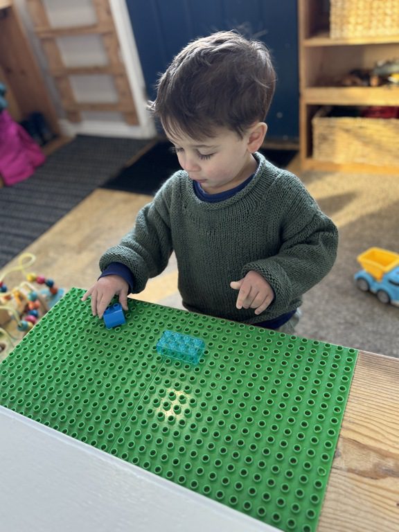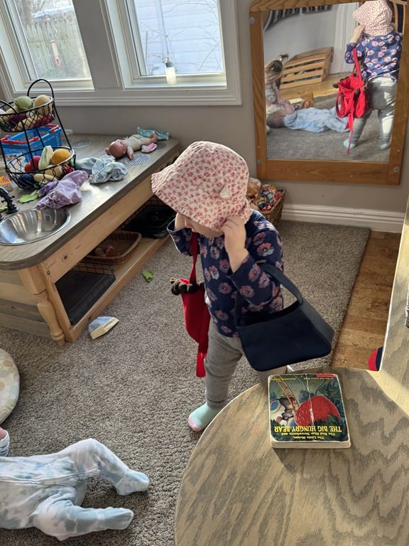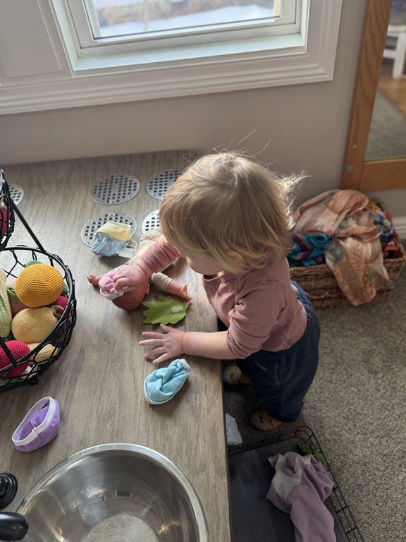We had a discussion about “imagination” this morning and how we can use it to create play spaces and story lines. We offered an “imagination table” today with a variety of loose parts to see if we could create imaginative places and stories with our play. Everything added was in the category of “loose parts” which means they are open ended without a specific purpose. This entices kids to use their imaginations in order to decide what the objects will become and how they will use them in play. This kind on imaginative play leads to creative thinking and social development.