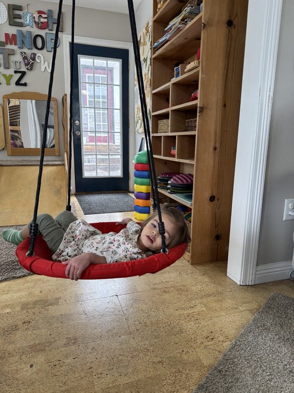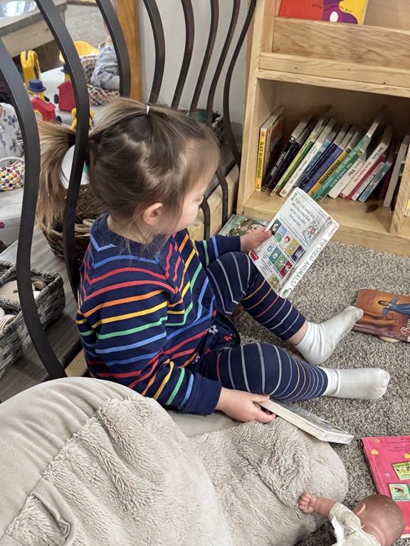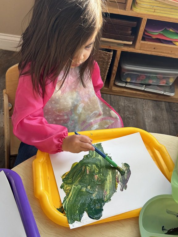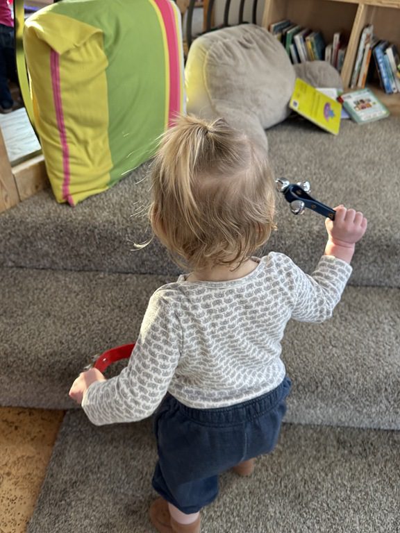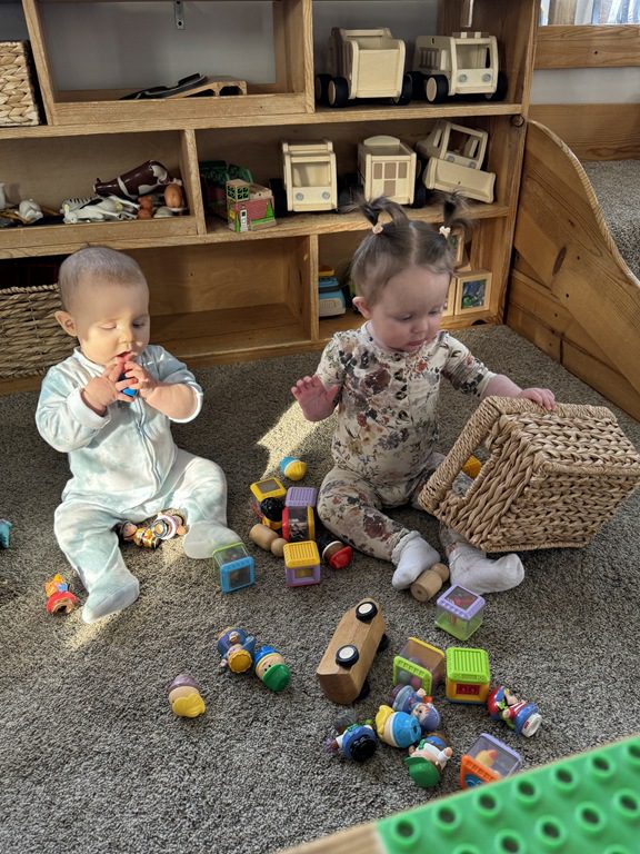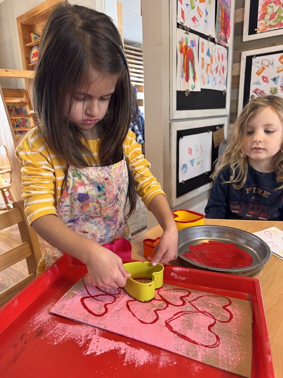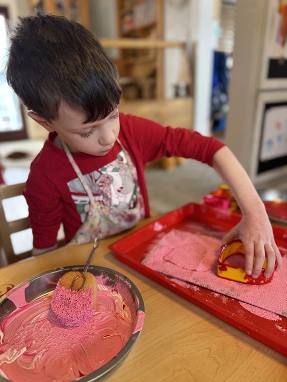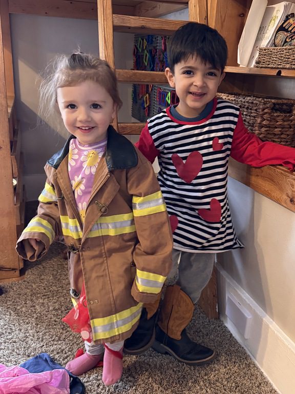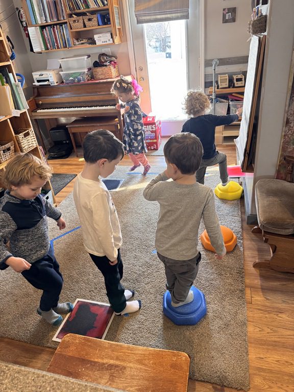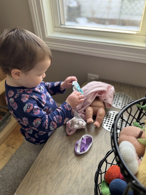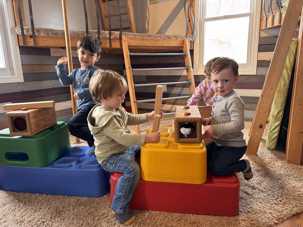 We had a discussion about “imagination” this morning and how we can use it to create play spaces and story lines. We offered an “imagination table” today with a variety of loose parts to see if we could create imaginative places and stories with our play. Everything added was in the category of “loose parts” which means they are open ended without a specific purpose. This entices kids to use their imaginations in order to decide what the objects will become and how they will use them in play. This kind on imaginative play leads to creative thinking and social development.