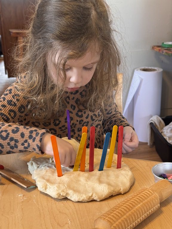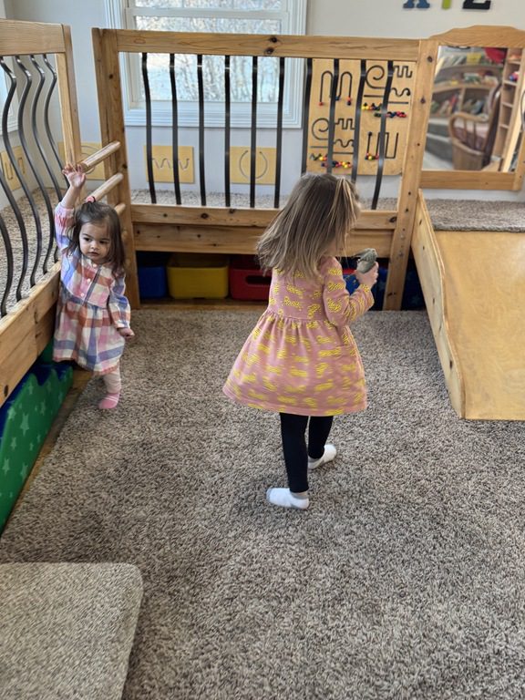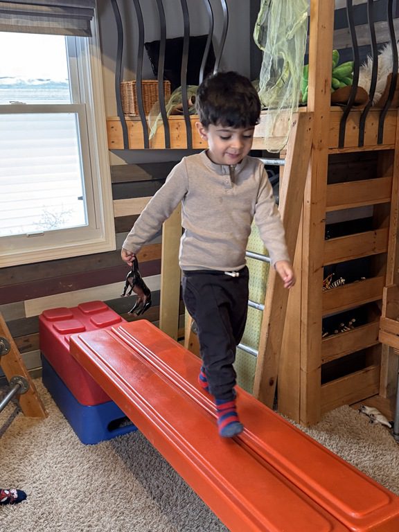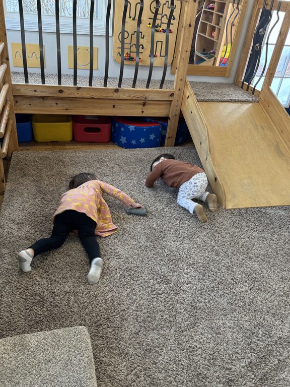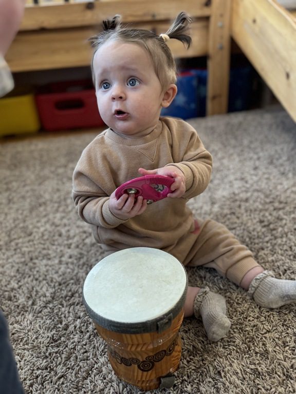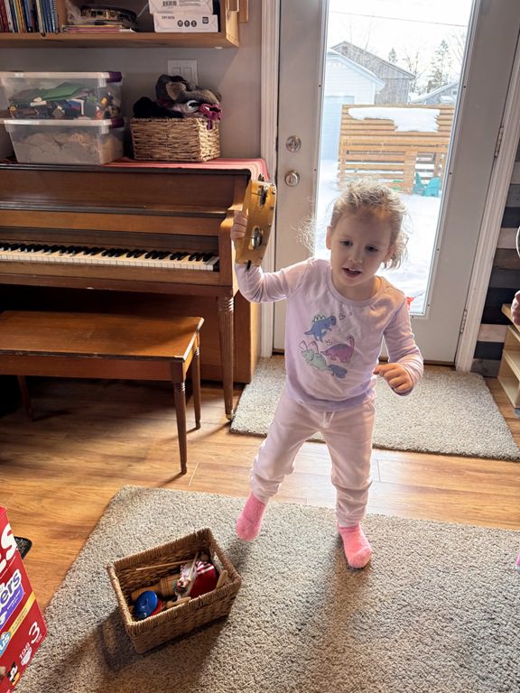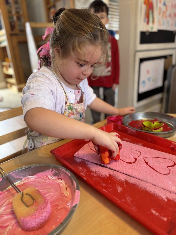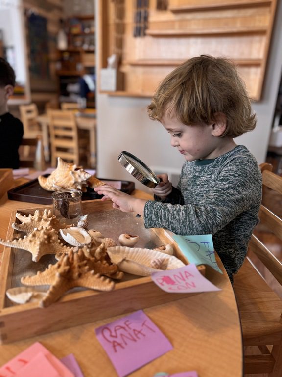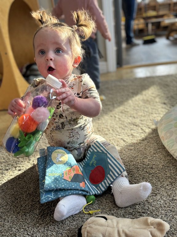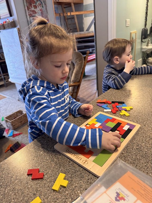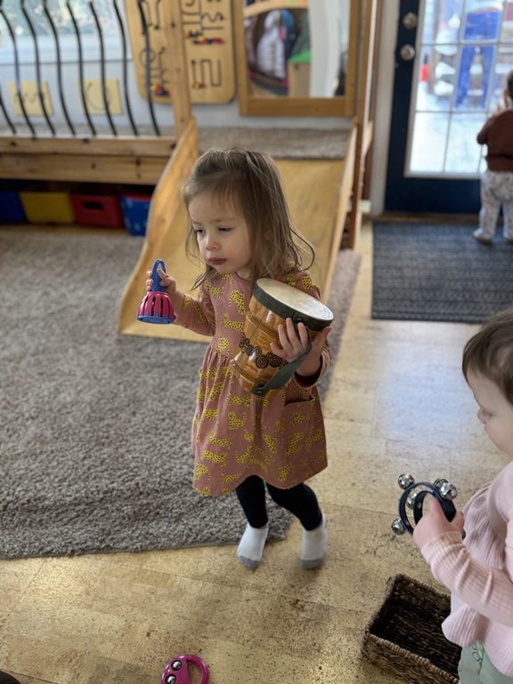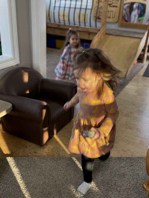 We had a discussion about “imagination” this morning and how we can use it to create play spaces and story lines. We offered an “imagination table” today with a variety of loose parts to see if we could create imaginative places and stories with our play. Everything added was in the category of “loose parts” which means they are open ended without a specific purpose. This entices kids to use their imaginations in order to decide what the objects will become and how they will use them in play. This kind on imaginative play leads to creative thinking and social development.
