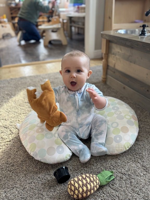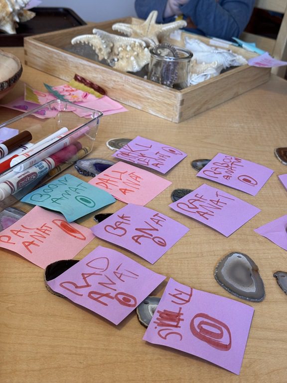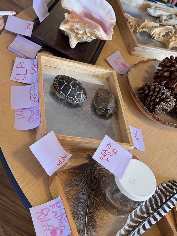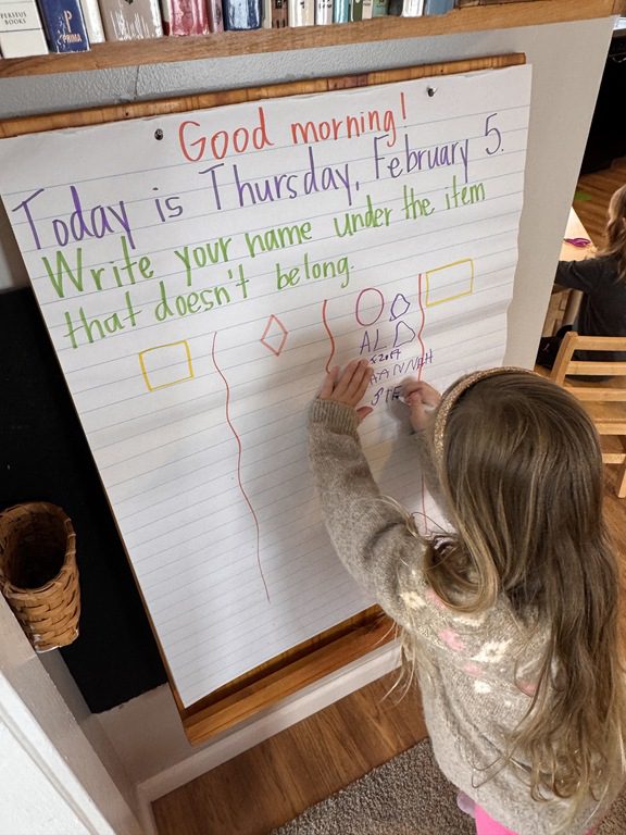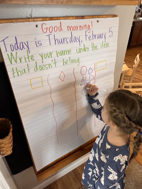 The sign in board was full of PREK1 friends comparing shapes. There were four shapes that children observed and they had to choose one shape to write their name under that didn’t belong to the group. They all wrote their name under the circle as the other shapes had four sides while the circle has zero sides!