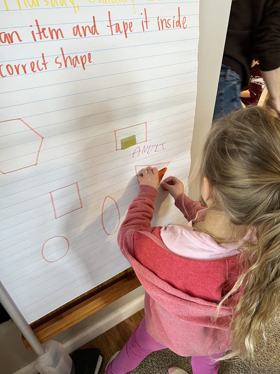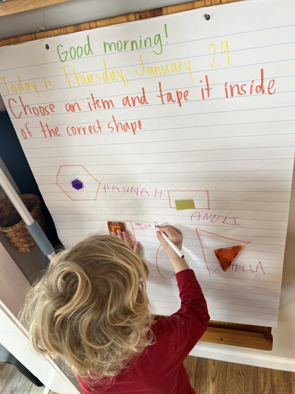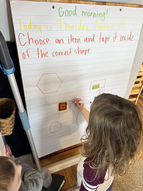 Our PREK1 friends came to sign in this morning where they chose an item from our classroom. They identified its shape and taped it inside the larger shape on the board.
