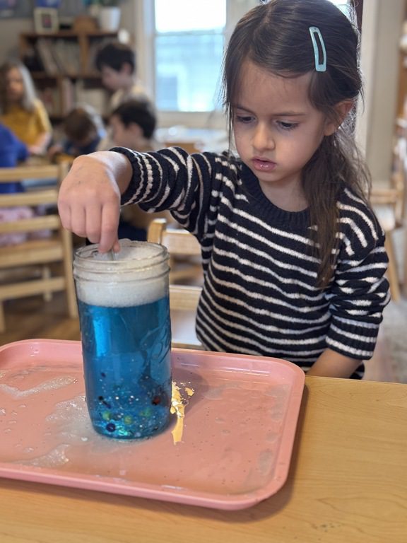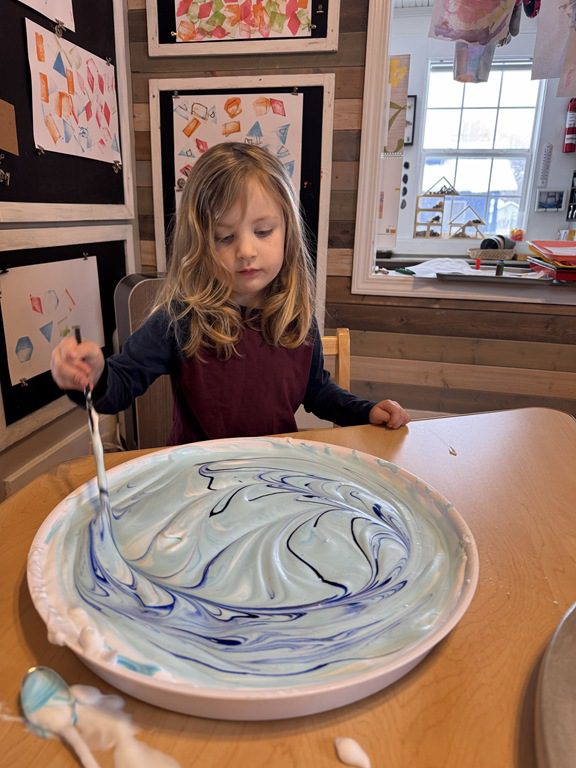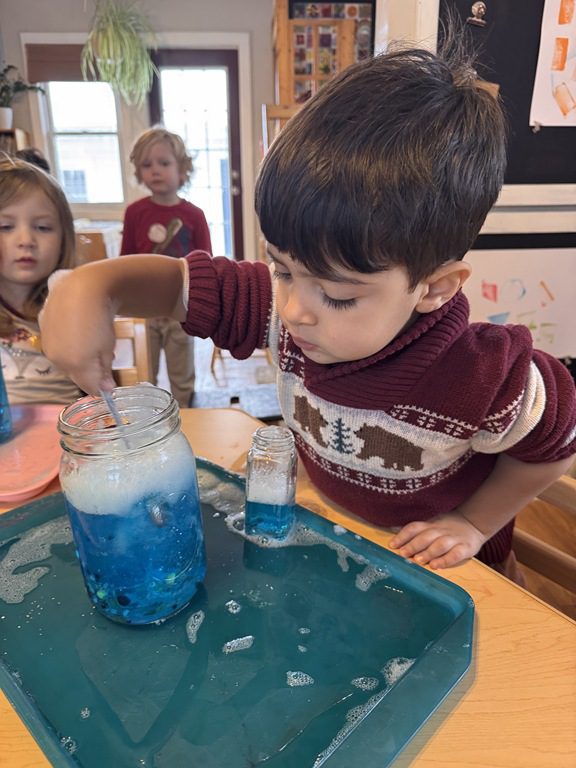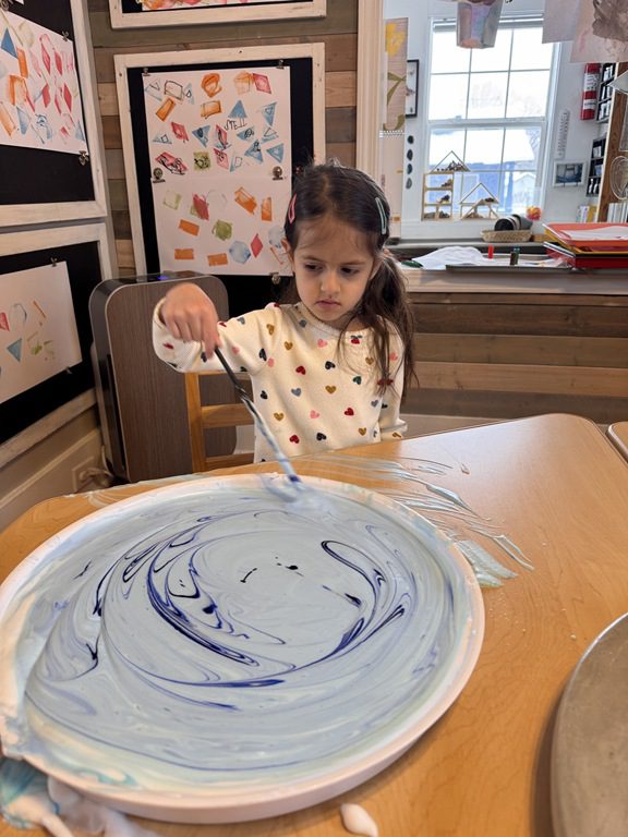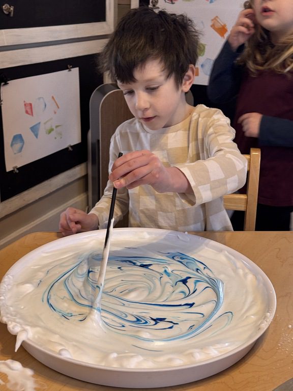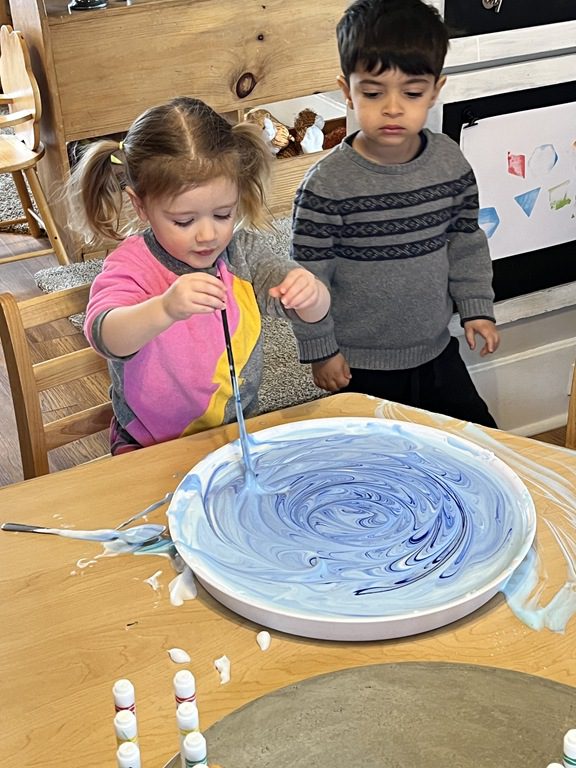 It has turned into a whole week of learning about storms in our child lead curriculum.  This morning we continued full steam ahead with our child lead storm interest.  A friend came in asking if we could make a hurricane today!  We decided to create the very large cloud that forms in a hurricane.  We talked about how it rotates the same way a tornado does, except it is very large.  We also learned the new word “Coriolis Effect”.  Older friends learned that this means in our hemisphere, the hurricane will turn counter clockwise.  We tried spinning our hurricane cloud counterclockwise on our model.  One friend shared that he had learned about the storm on Jupiter that looked like this and has been going on for one hundred years.