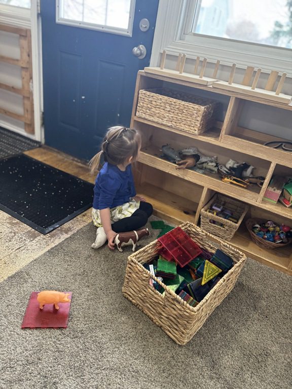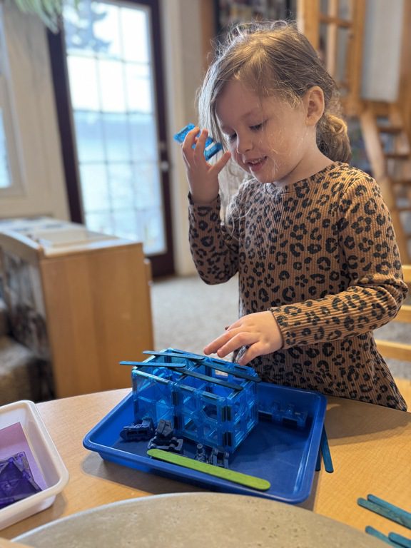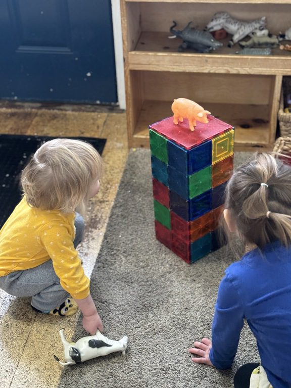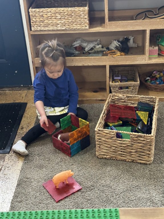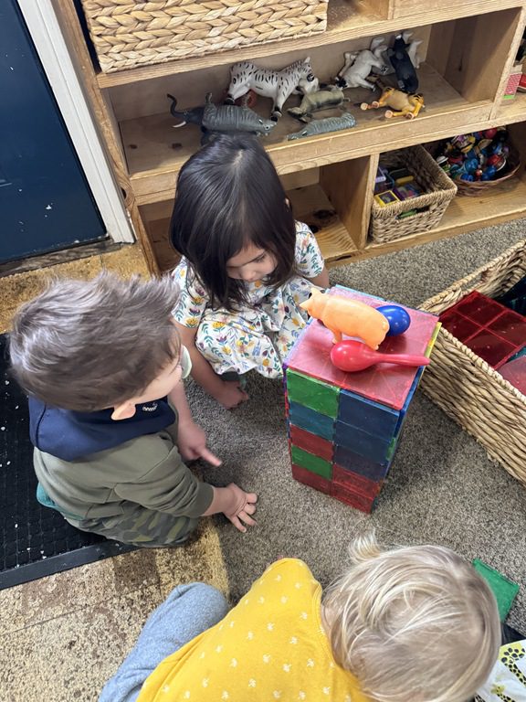 This morning, one friend built a Magna-Tile house with a cow inside it. Many of her friends joined her and looked at the house and the cow inside.