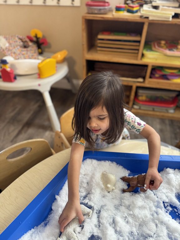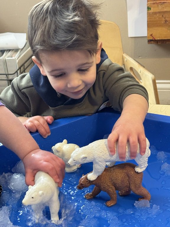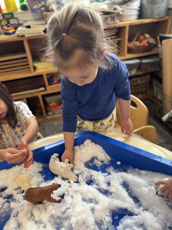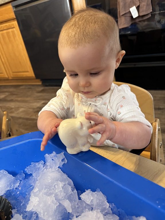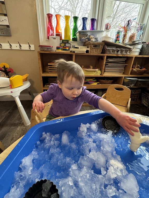 In the kitchen, we engaged with polar bears, snow, water and ice cubes in our blue Tuff tray!