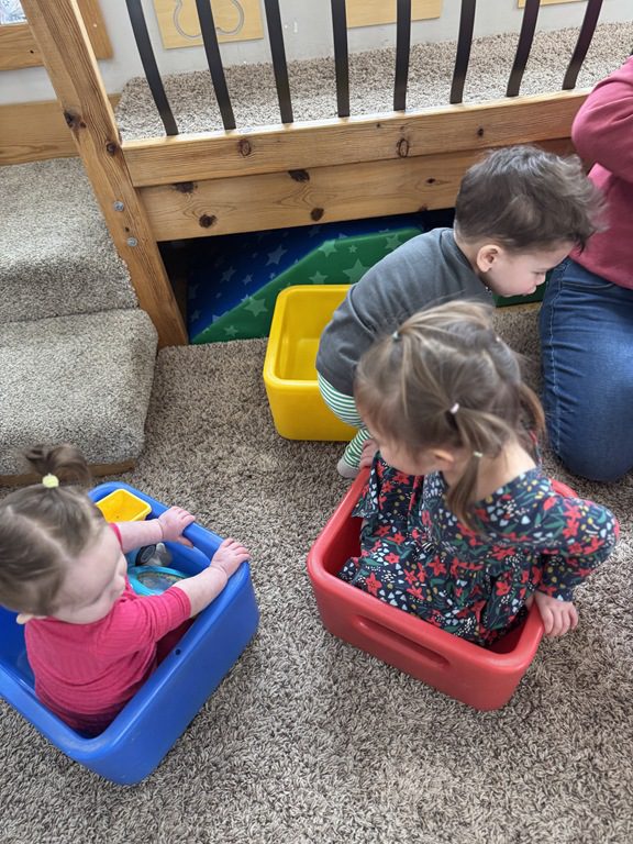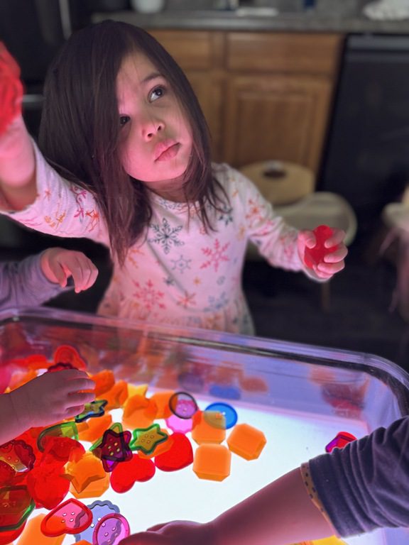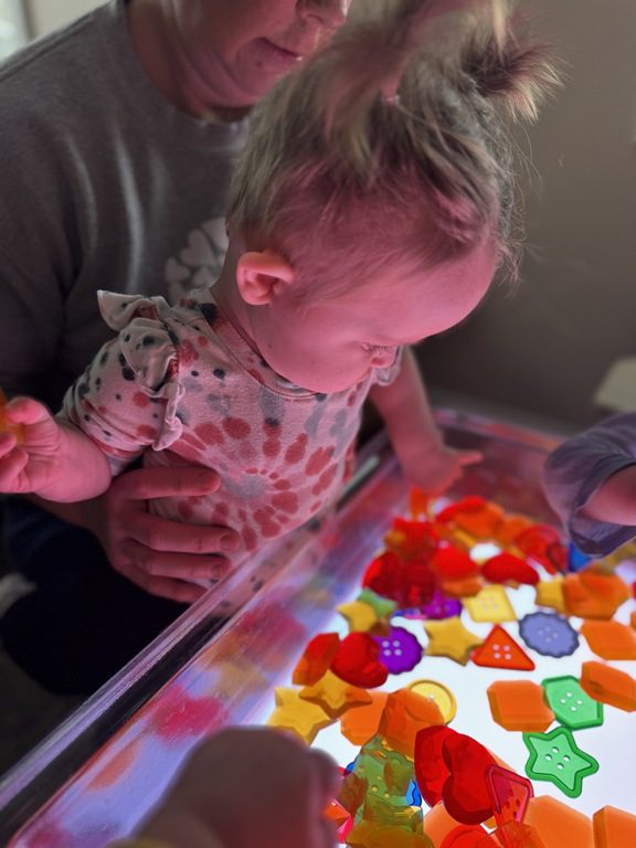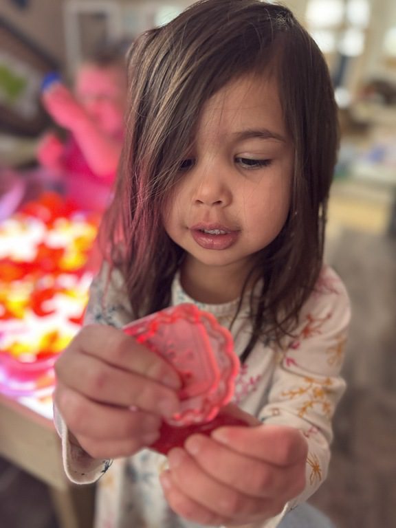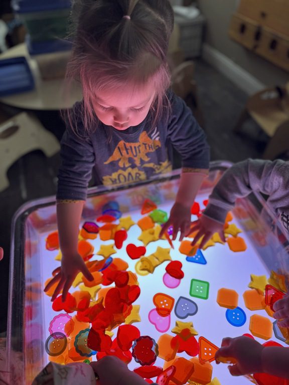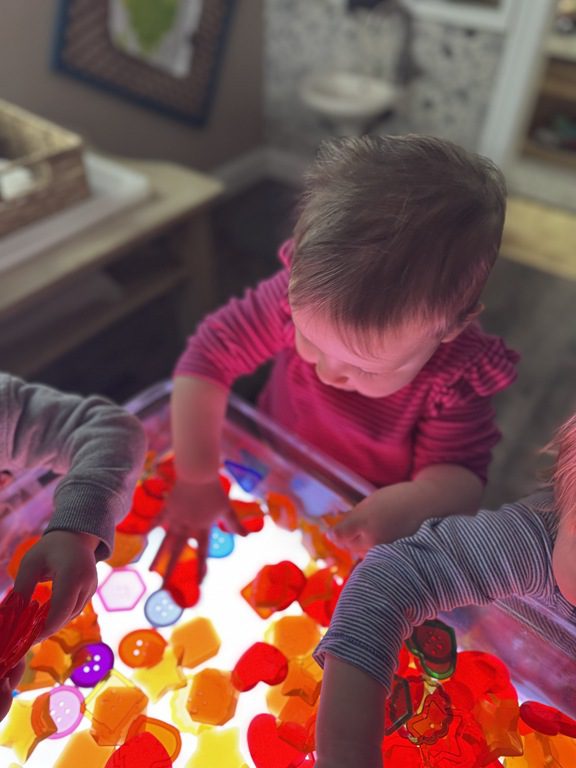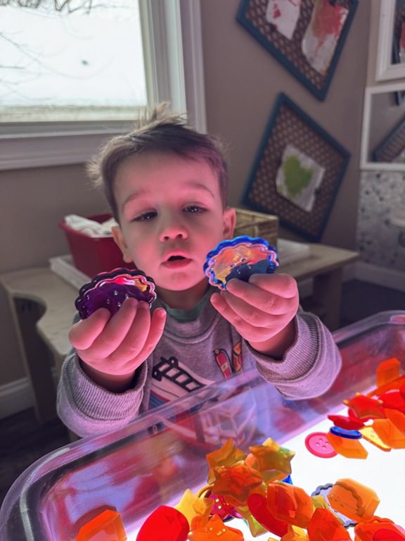 We engaged with translucent shapes and buttons this morning, looking at all the colors and shapes that we saw.