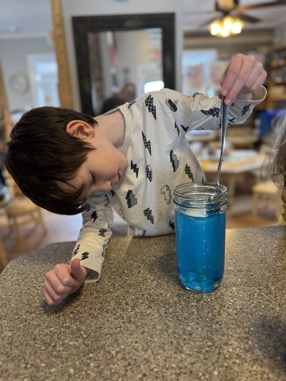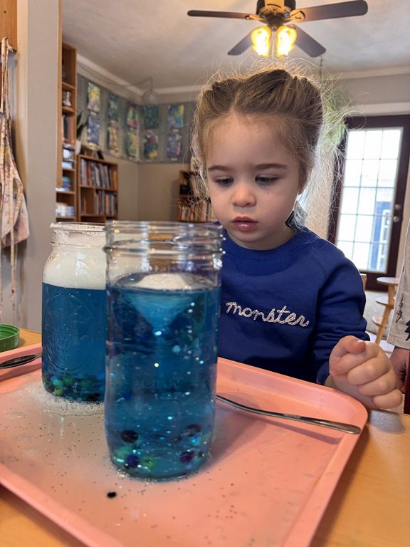This morning, we had some more interest in creating “jar storms”.  A friend asked if we could learn about tornadoes so we created one in a jar.  We used our small model to learn about what is  happening in a tornado.  First, we added a teaspoon of dish soap to a tinted jar of water.  We also added a little glitter and some beads to act as “debris” one might find on the ground in the path of a tornado.  Next, we used a long spoon to stir up a funnel.  We could see a tornado form in our jar and reach to the ground, picking up the debris.  We noticed that smaller debris was lifted up into the tornado, while larger debris was moved across the bottom of the jar but remained low in the water.  We learned that a tornado acts much like this when it picks up objects off of the ground.  We also noticed that when we put the spoon back in, the tornado dissipated.  We talked about how a tornado does this when it hits large land formations such as mountains.  Another thing we explored was jar shape.  We tried different shapes and found that the tall thin cylinder shaped jar worked best!