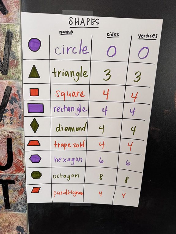 Later on in group, we filled in a shape chart! There were several 2-D shapes that we identified and counted the number of sides and vertices of each shape. We noticed a pattern pretty early on; the number of sides and vertices are the same for each shape. We also loved the word ‘parallelogram’!