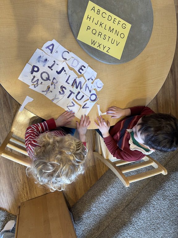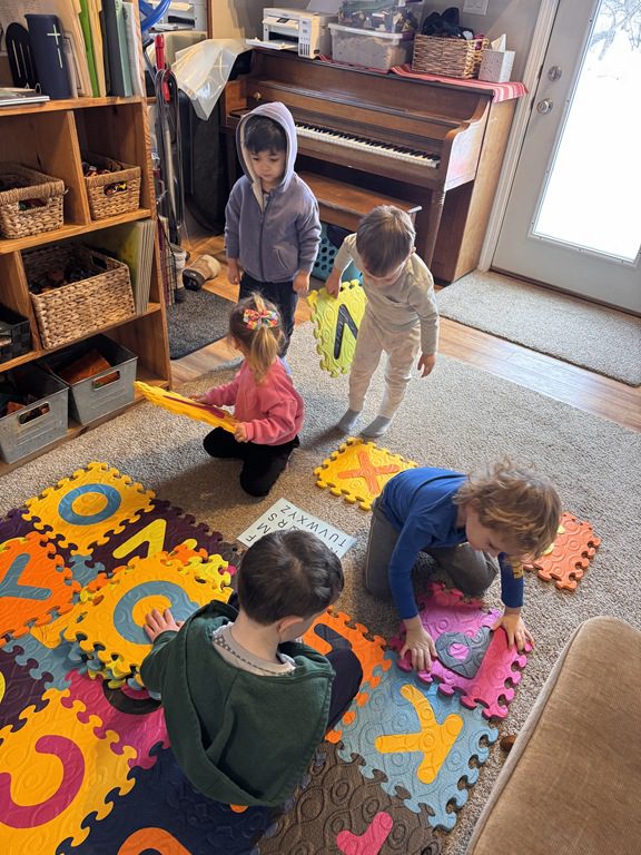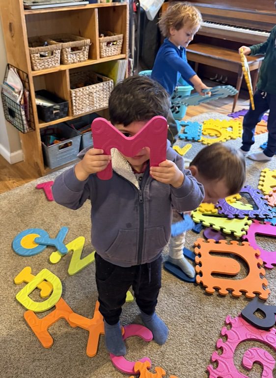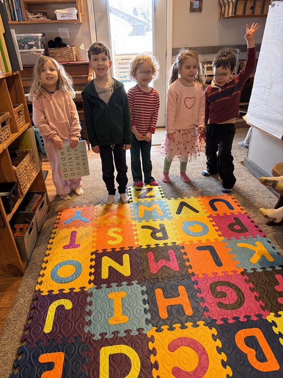 This morning a friend came into class asking if we could put together the giant alphabet floor puzzle.  Several kids worked to assemble the puzzle as a group.  One of our kids took on the job of reading off our letter sheet so friends would know which letter in the alphabet came next.  It became a great project to practice communication, cooperation and group planning, all child driven.  After the puzzle was done, the group spontaneously came up with a game taking turns to jump to their name letters.  Amazing!