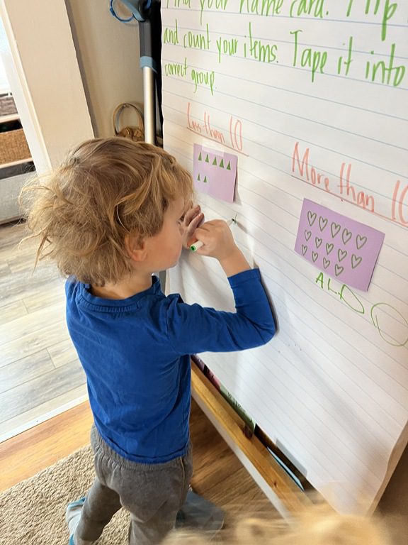 We continued working with numbers for our PREK1 group sign in. Each group member came to sign in where they were asked to find their name, flip over their card, and count the number of items that were drawn on their card. Then, they had to determine if that number was less than 10 or more than 10. They taped their card into the correct group.