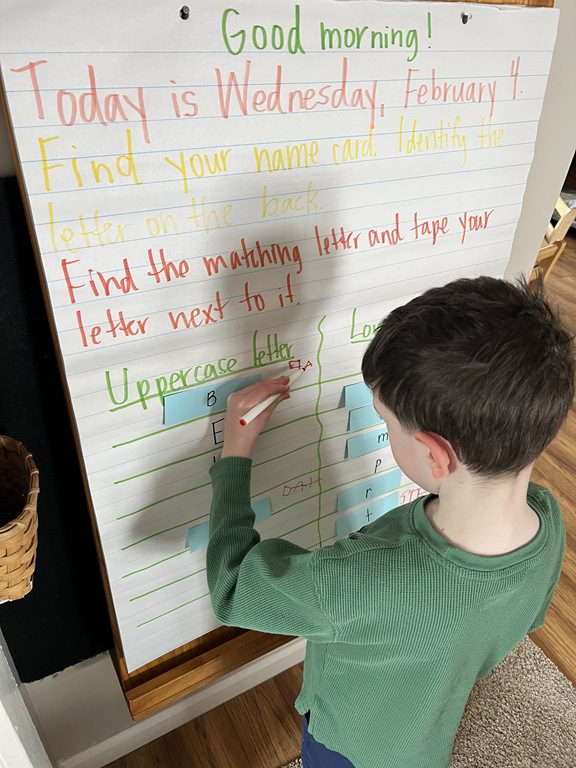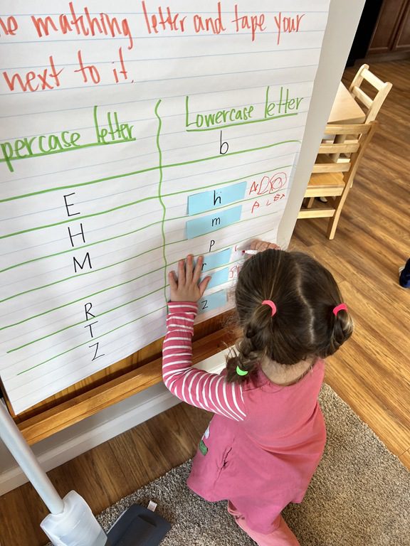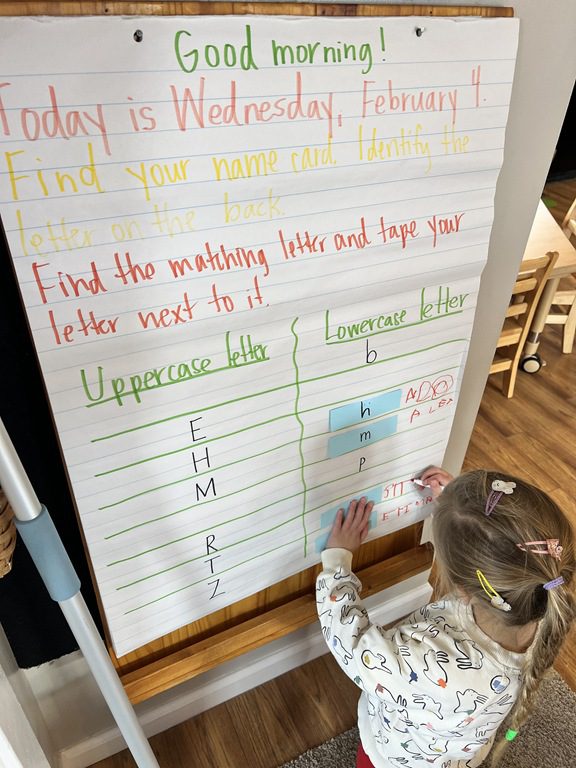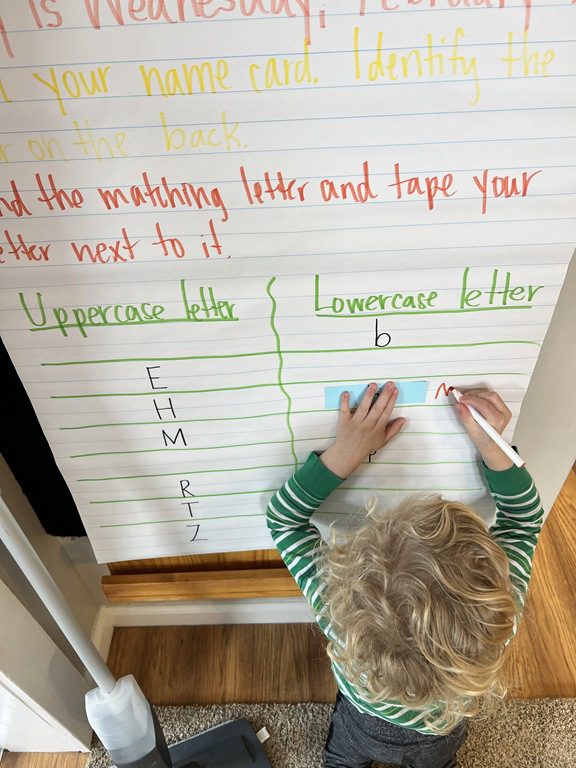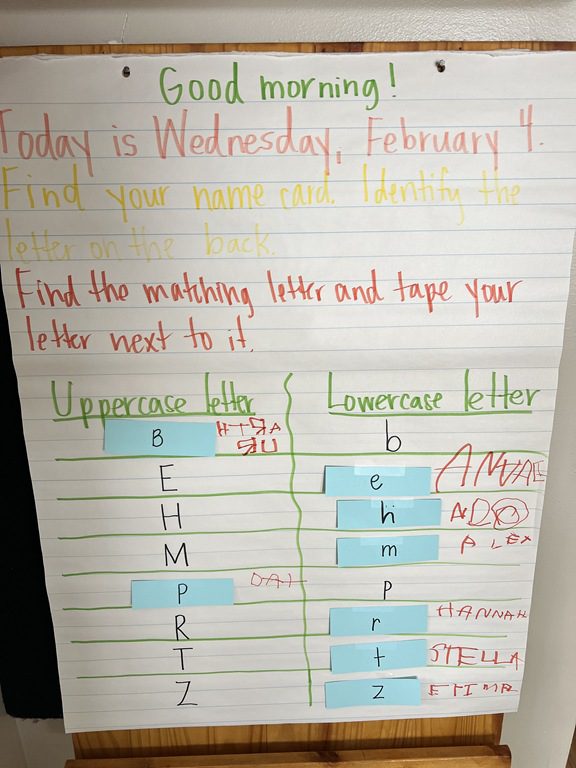 We worked together to fill in the missing spaces on our chart that separated lowercase letters and uppercase letters. Each PREK1 group member came up to the board where they found their name card and identified the letter on the back. If their letter was an uppercase letter, they searched for the lowercase match.