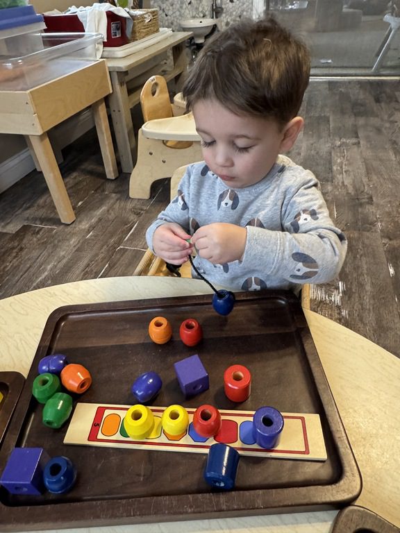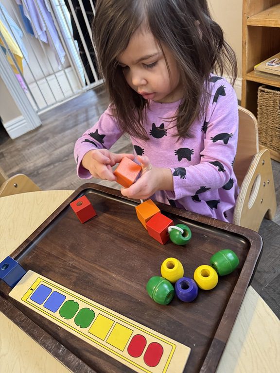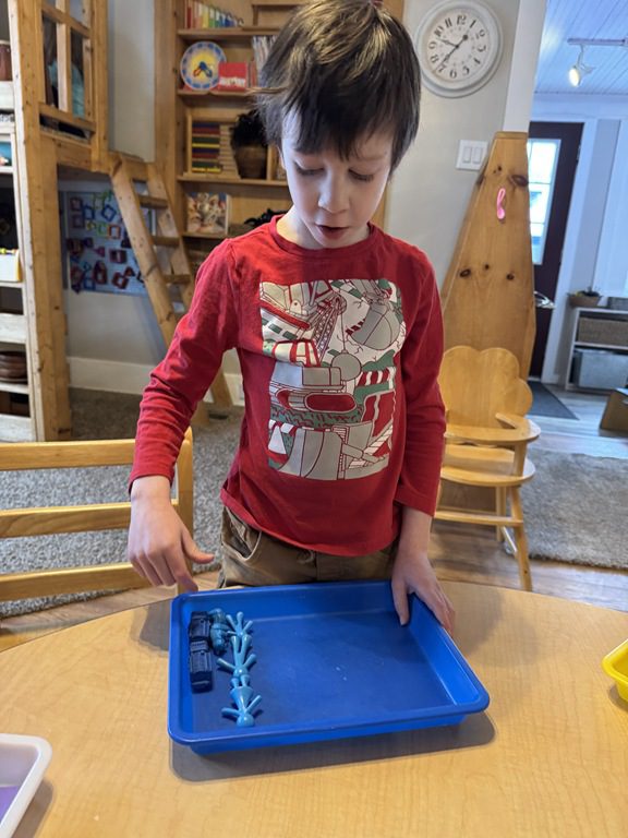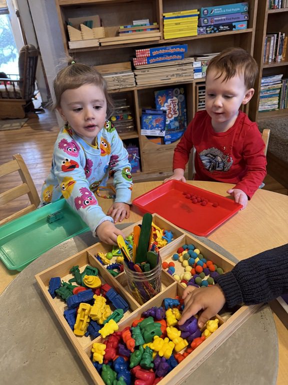 This morning, we offered a sorting activity at the round table which encouraged friends to sort by color and shape.  Kids looked through the tray of objects and picked out all of the items that matched the color of their tray.  Further, some kids sorted the objects within their tray by shape.  As kids worked, many of them realized they could build something with their objects.  One friend made a “blue box” to put all of her blue things into.  Another friend made a red playground for her red bears.  Everyone had fun figuring out what they could make within this open ended activity.