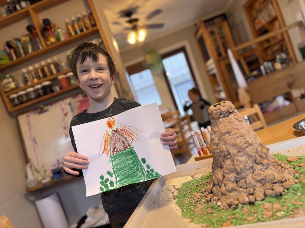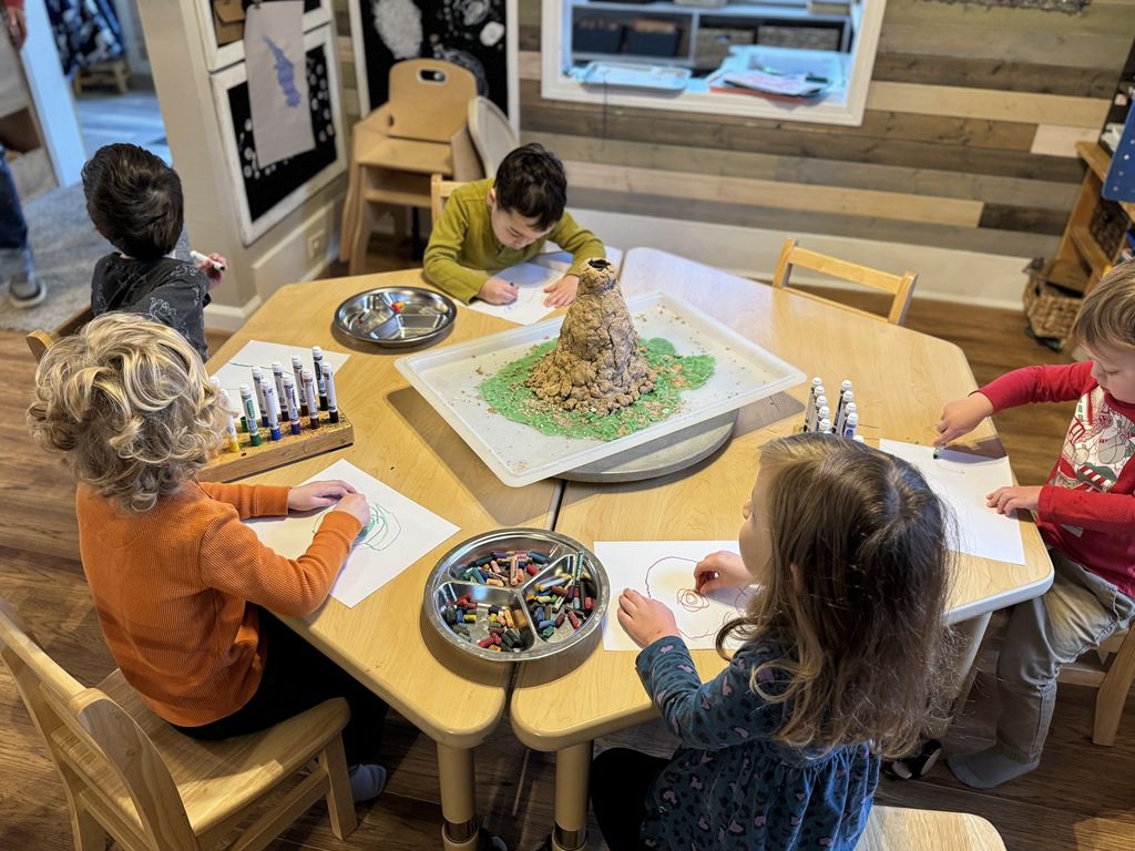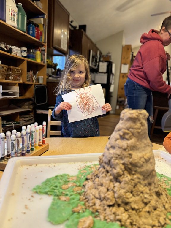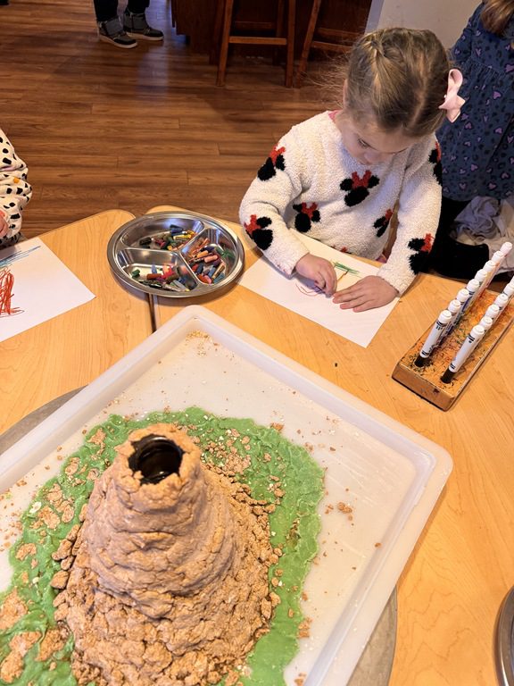We have been practicing patience as our volcano creation dries.  We decided to work on a volcano drawing in the art area this morning.  We used oil pastels to draw the volcano.  Many kids chose to add lava flowing down the sides or magma pushing up from under the ground.  These things were illustrated in the book we read and we were excited to see how much of this information kids were able to retain!