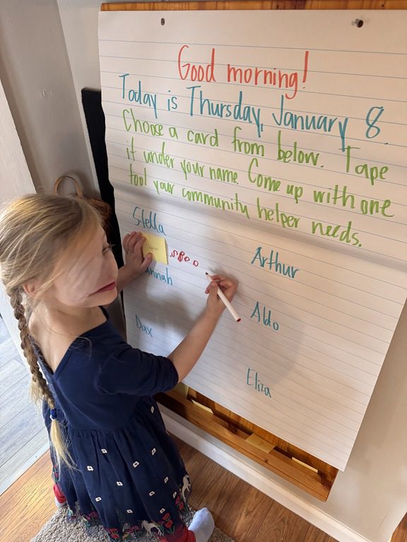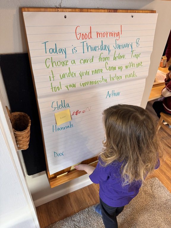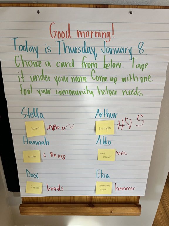 We continued to discuss community helpers today in our PREK1 group. Group members came up to the board where they found their name and chose a card that had a community helper written on it. They came up with one tool that their community helper needs to do their job!