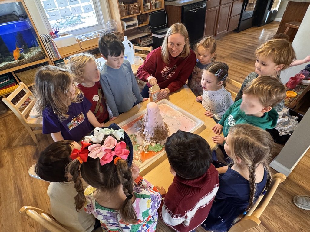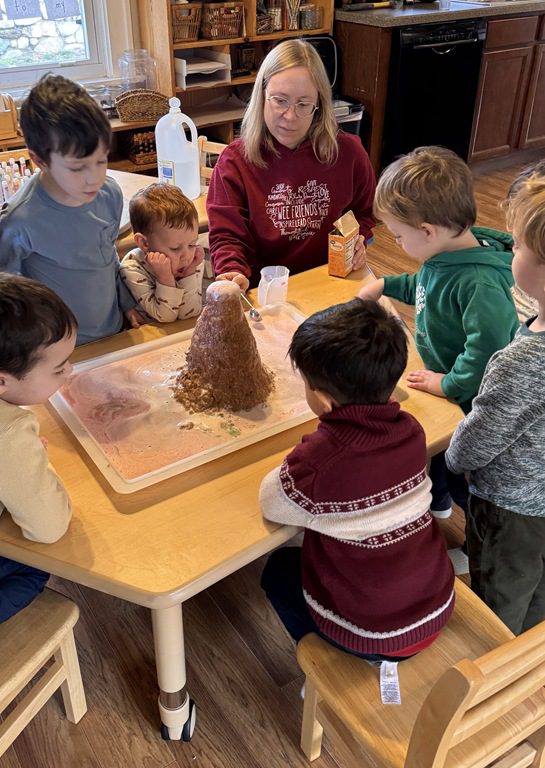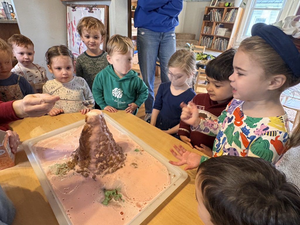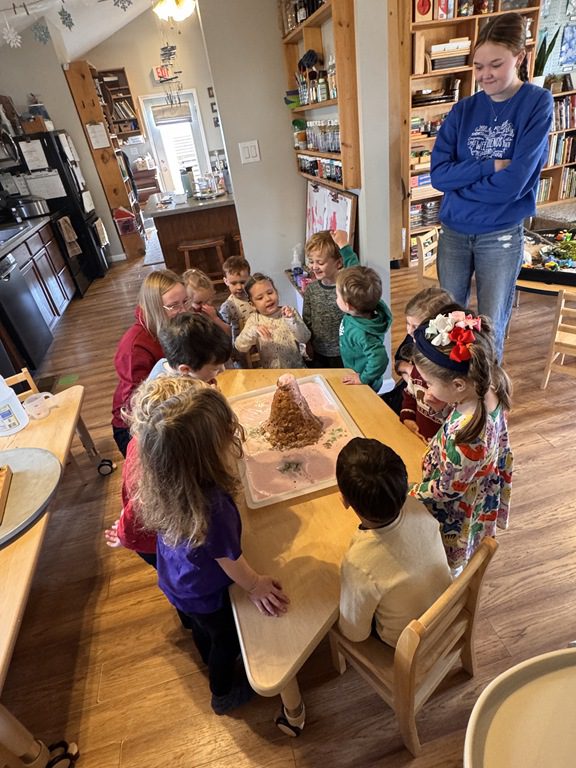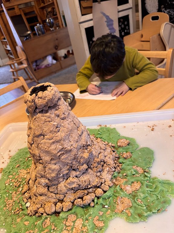 Today, we finally got to create our long awaited volcanic eruption!  Everyone was so excited to see what would happen.  We talked about each ingredient that would go into the volcano and how those things would create a chemical reaction when they were combined.  We added soap, water and baking soda which filled the volcano.  When we added the vinegar, we got the volcano to erupt with a pulse of foam which cascaded down the sides like a real volcano!  We got to try adding more baking soda so we could watch the change in the reaction.  It was exciting to see!  We even got to talk about how the foam covered the ground like real lava, which is how new rock is formed when it cools.