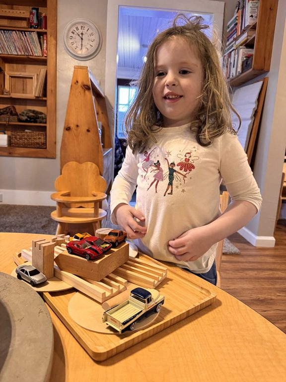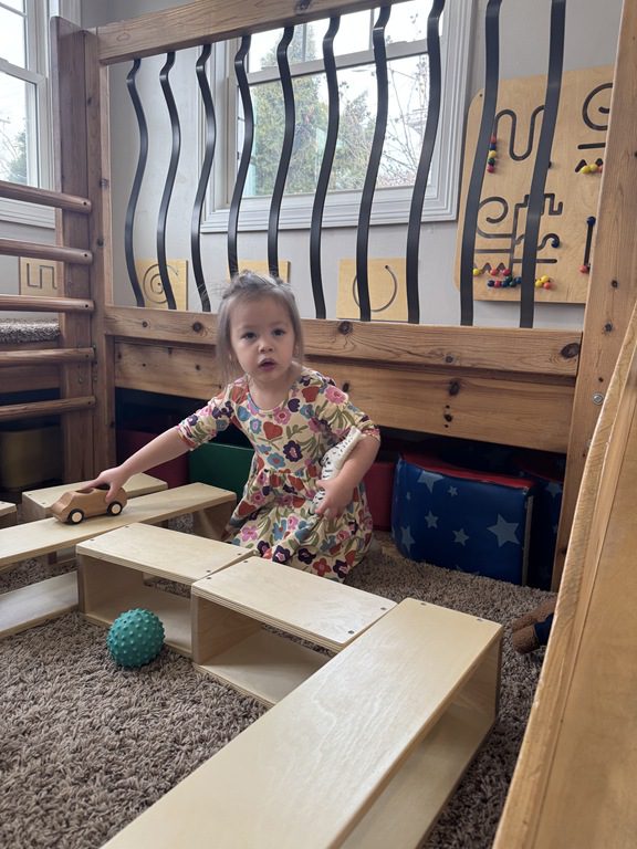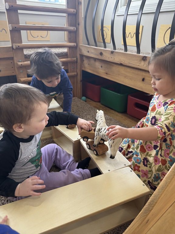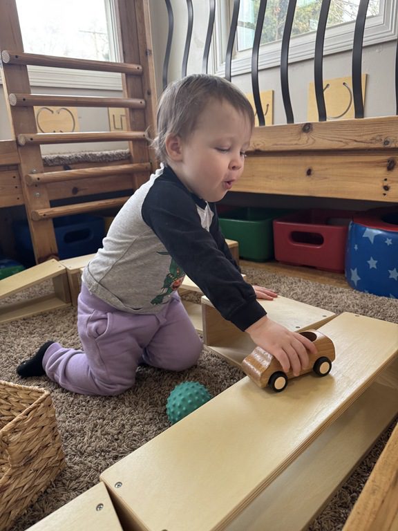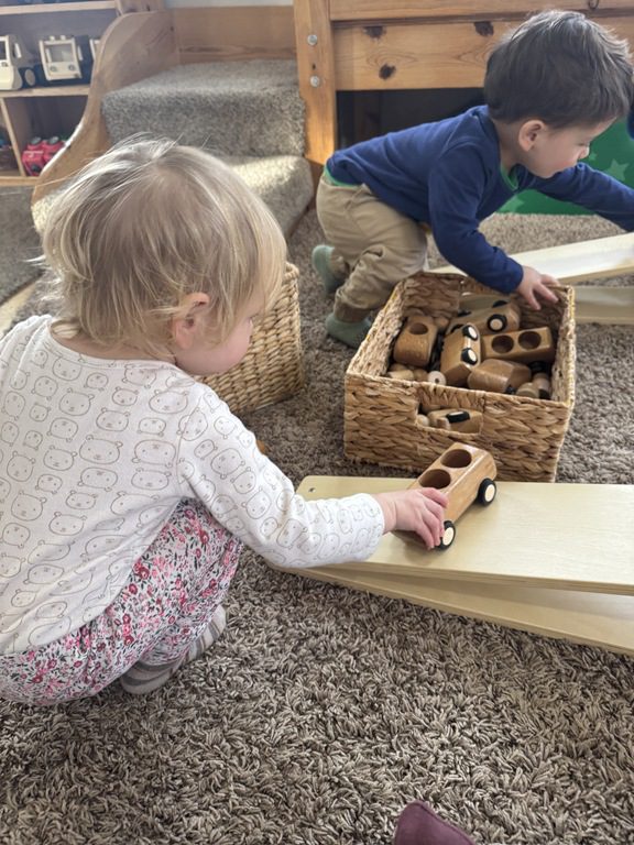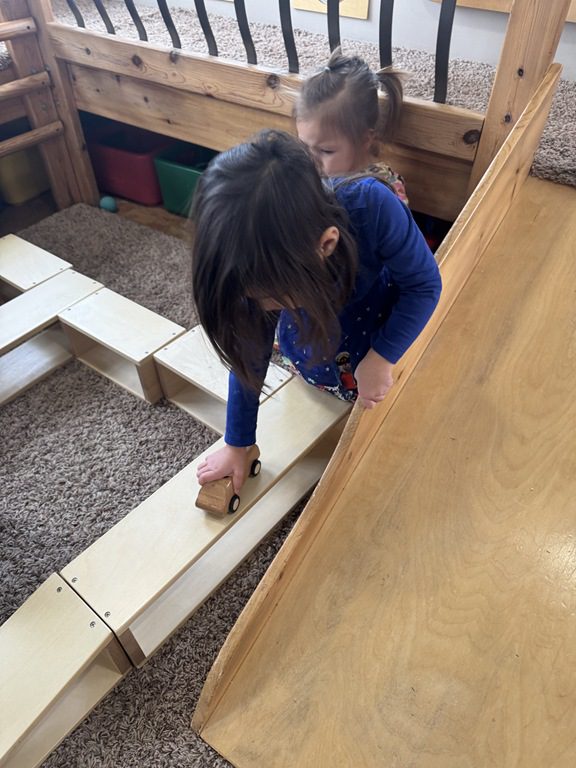 Then, Miss Audrey used hollow wooden blocks to make a track for cars to drive along. One friend played with a zebra while others drove their cars along. After her friends were done, Diana had a turn with the cars too!