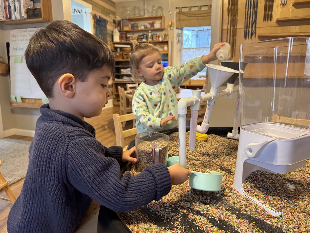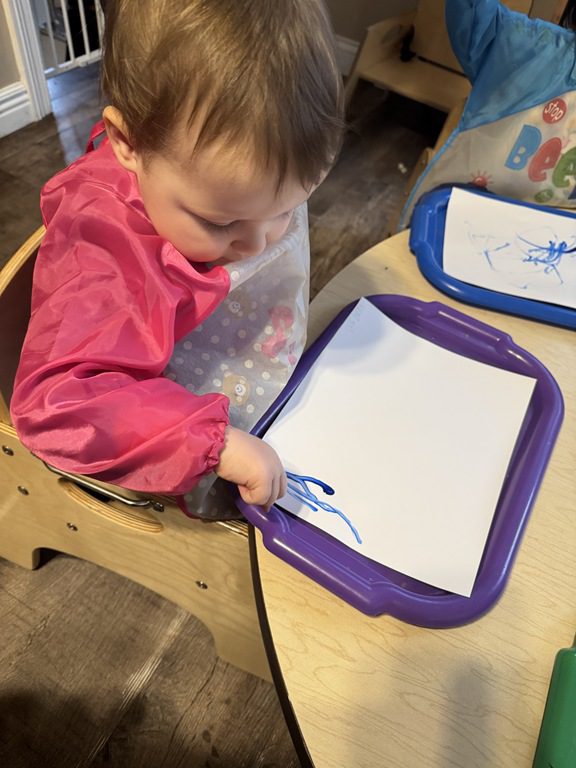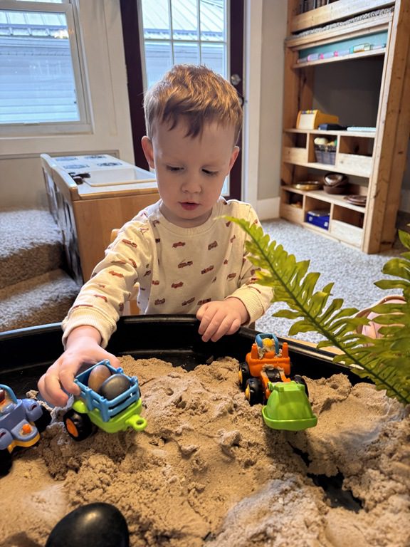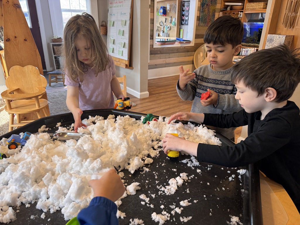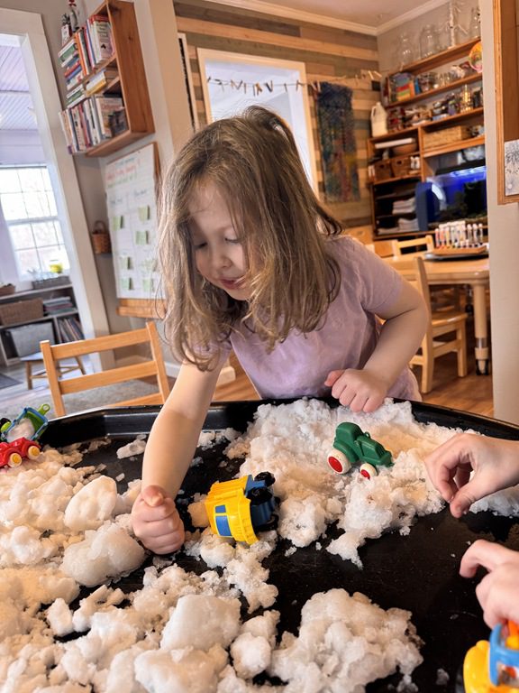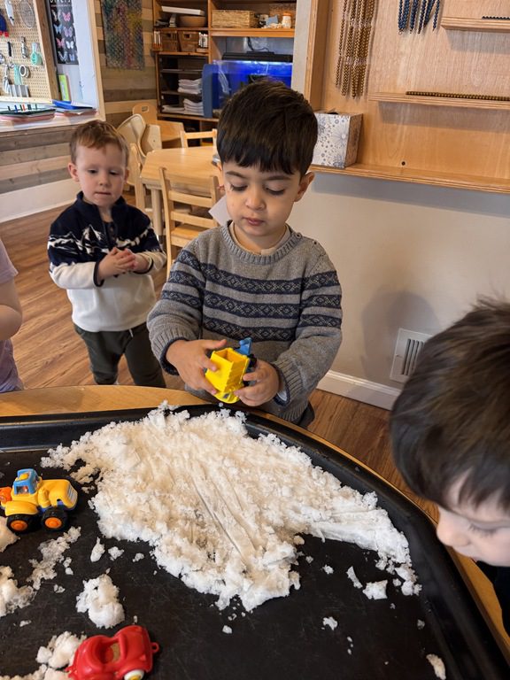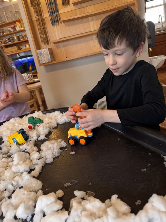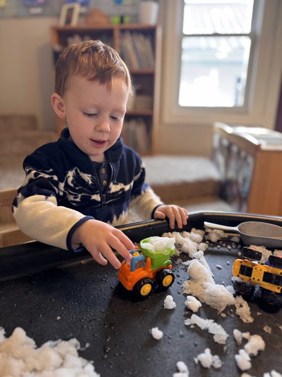 This morning a couple of our friends asked if we would be using the Tuff tray today.  I asked if they had an idea for the Tuff tray which it turned out, they did.  They asked if we could put snow in it from outside and then add some construction vehicles so they could pretend to be moving snow.  I thought it was a great idea and followed the description they gave, setting it up how they imagined.  This project took every bit of snow we had accessible in the back yard, but it worked:)  It’s great for kids to drive project ideas like this.  They use their executive planning and creative problem solving skills to create something the whole class benefits from.  When kids are able to see their ideas take shape in a way, it builds their self esteem.