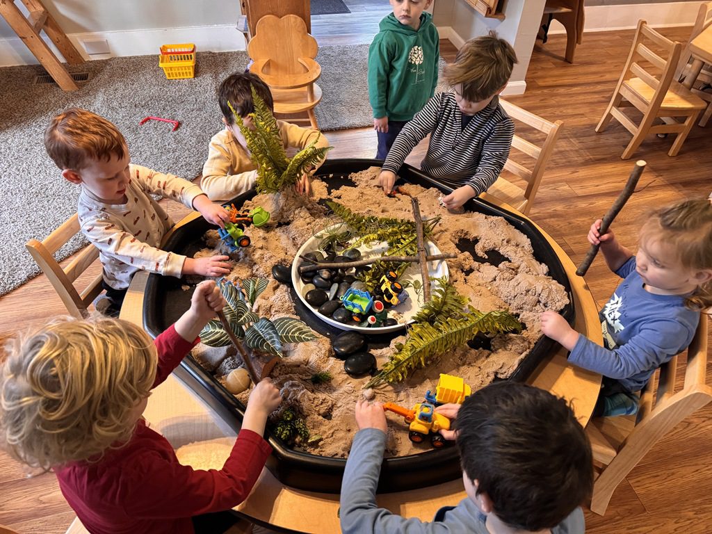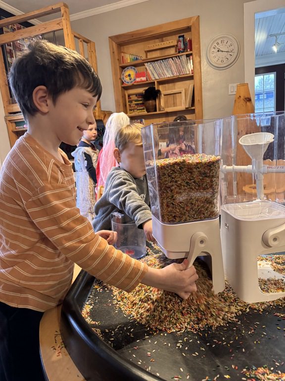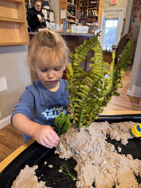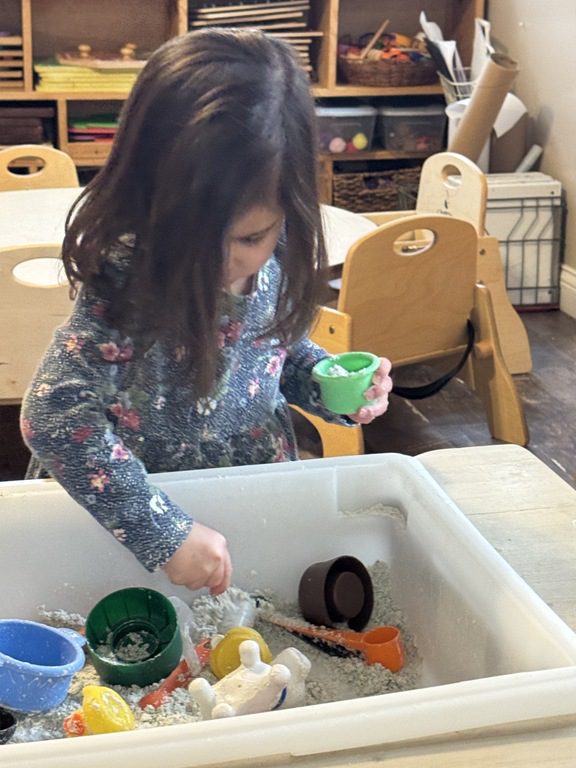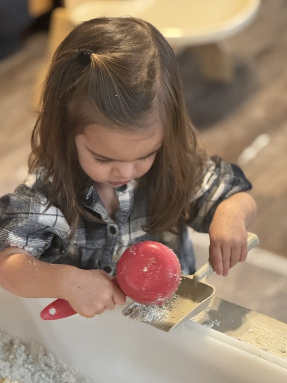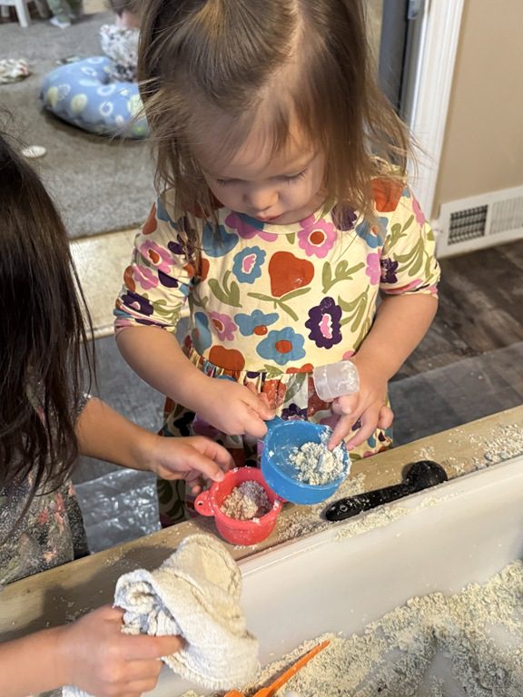 This morning we engaged in a new sensory experience in the sensory table, moon sand.  We enjoyed scooping it up with a measuring cup or spoon and pouring it into a different container.  We also explored the different water/land animals  in the table.
