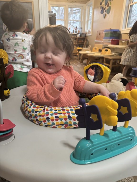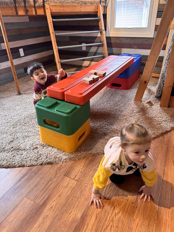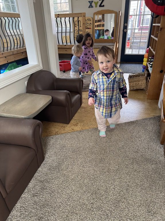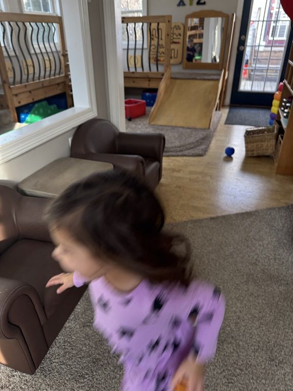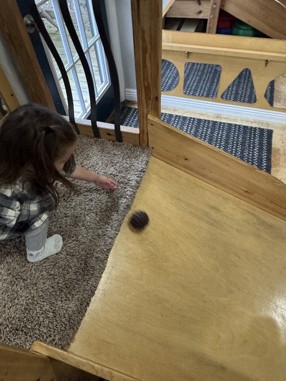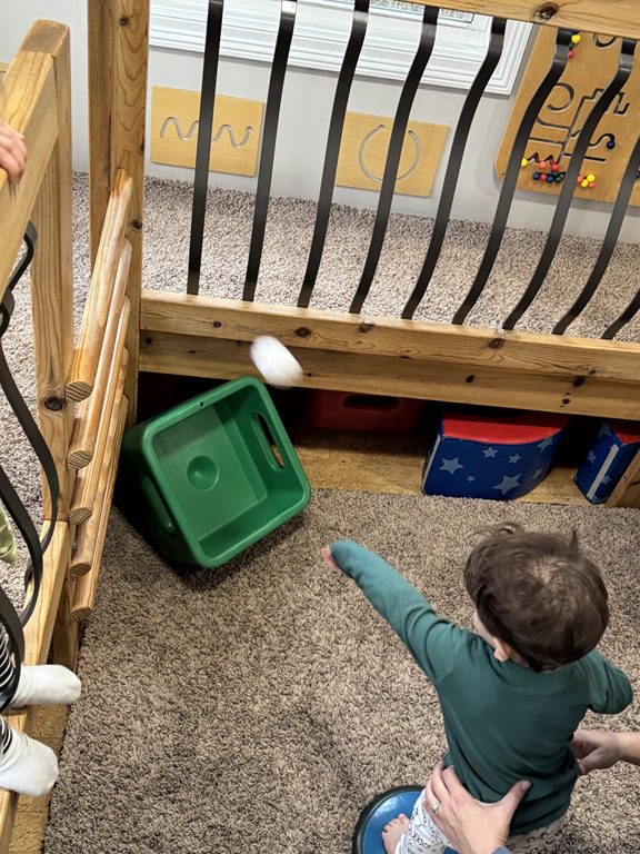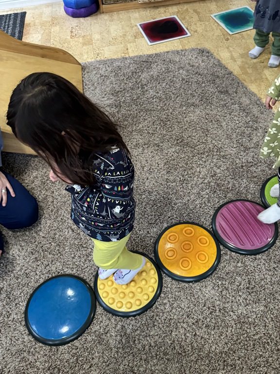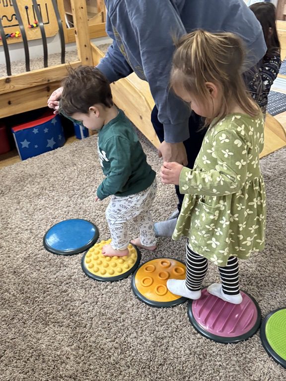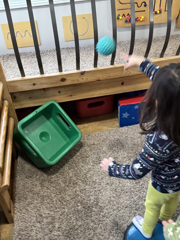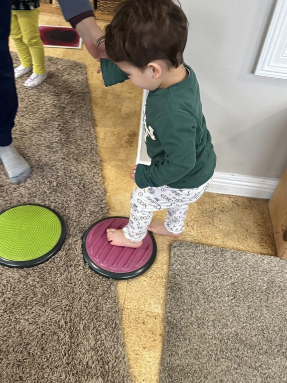 This morning we engaged with an obstacle course.  We walked across the textured stepping stones to toss a ball into a plastic block.