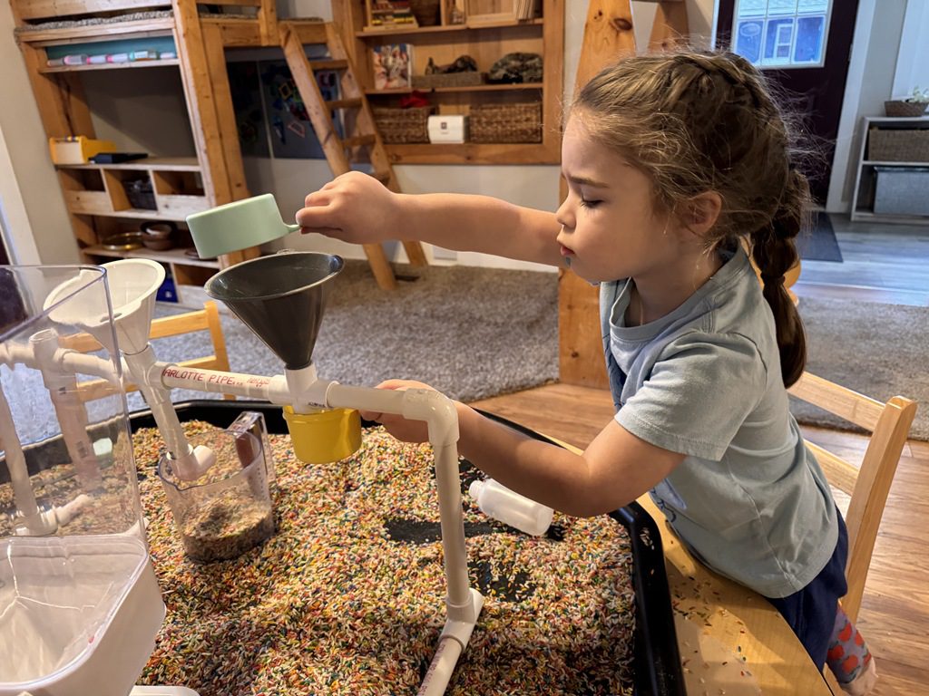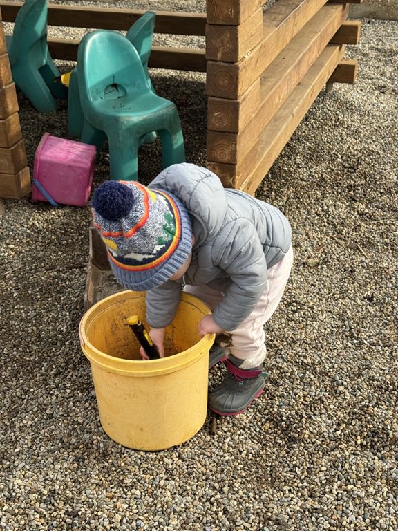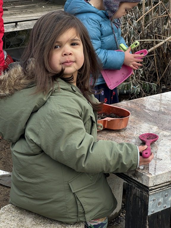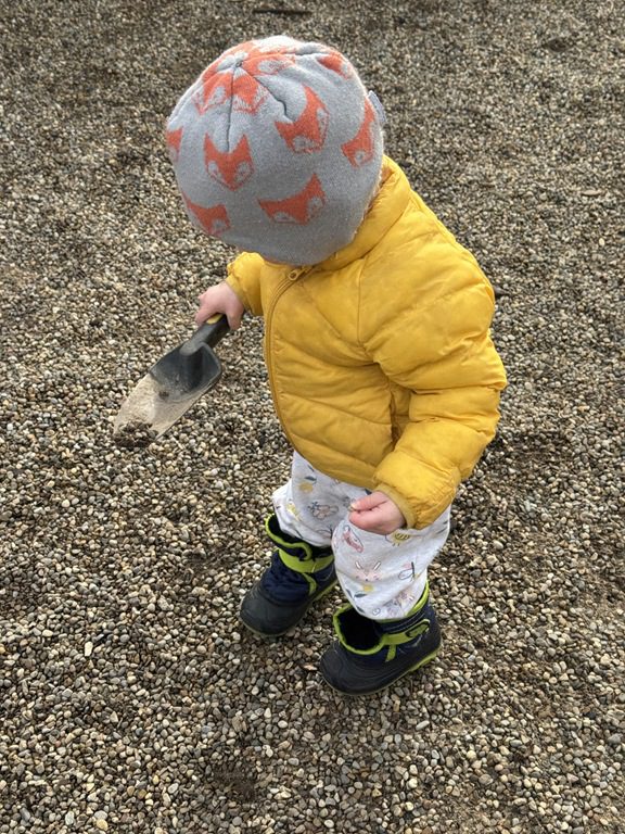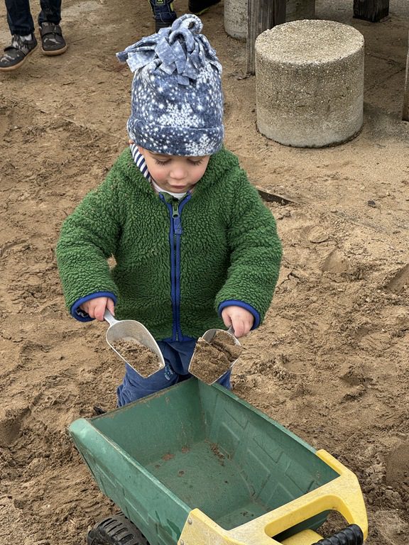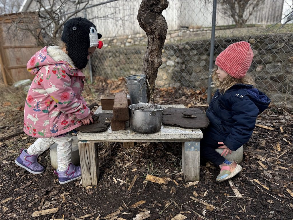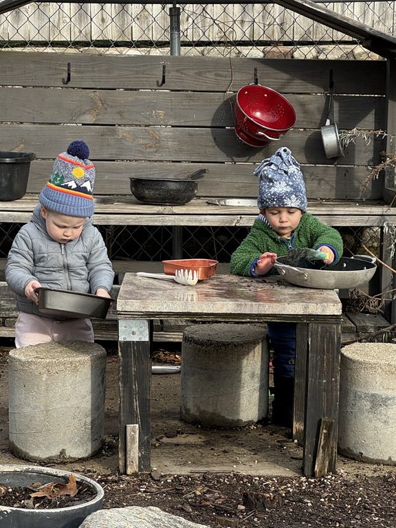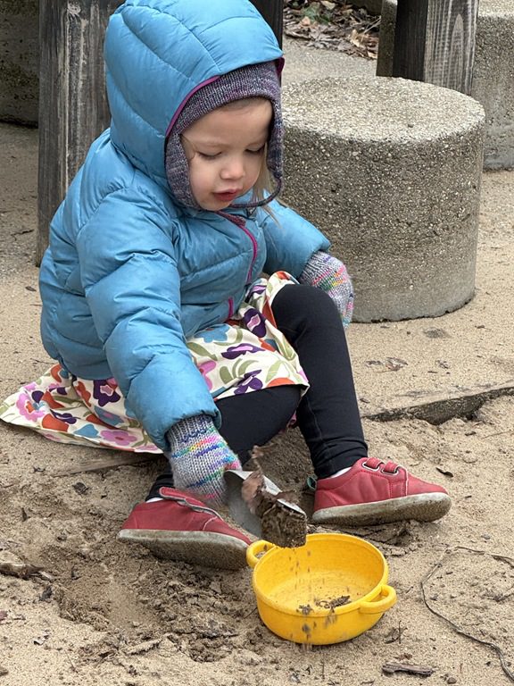 Outside, we scooped gravel and sand and we cooked in the play kitchen!