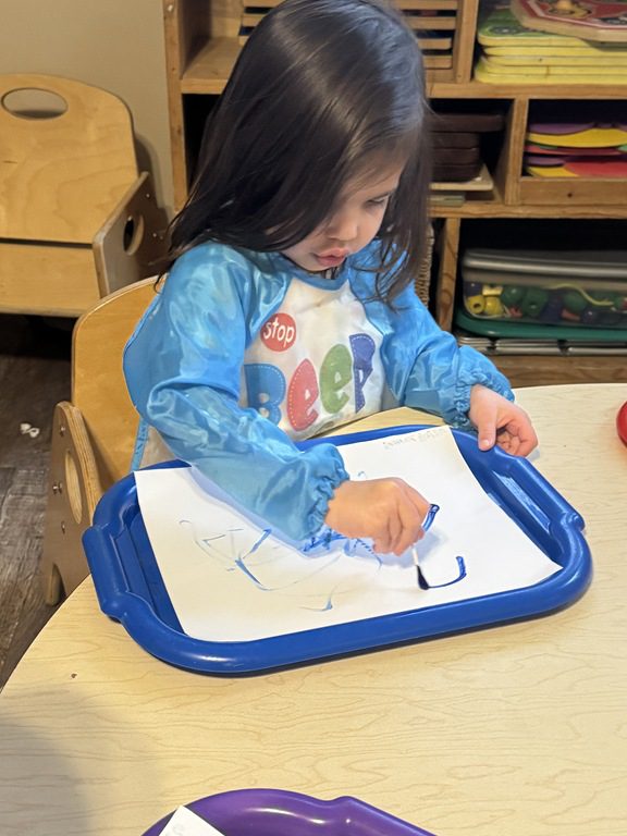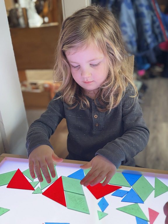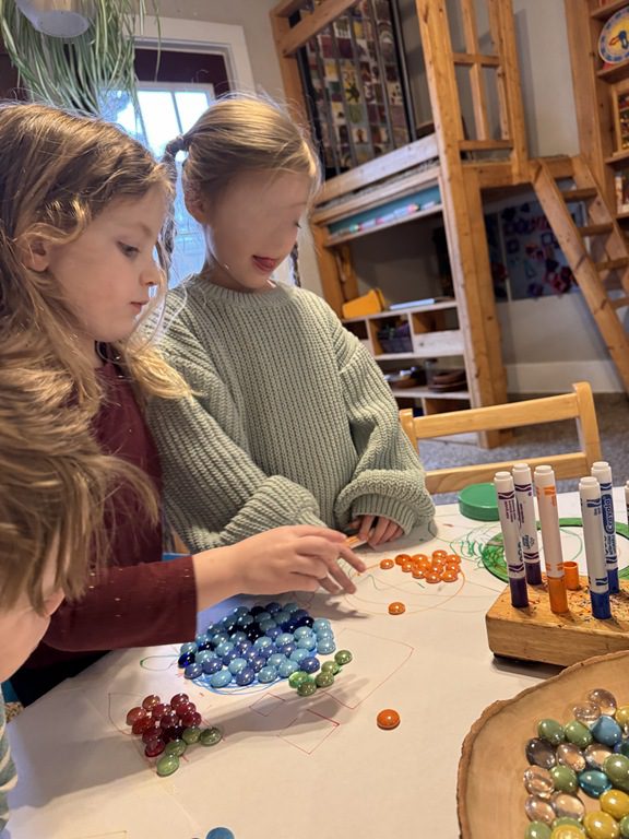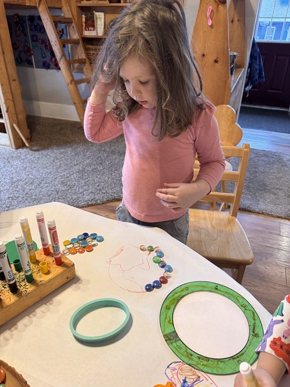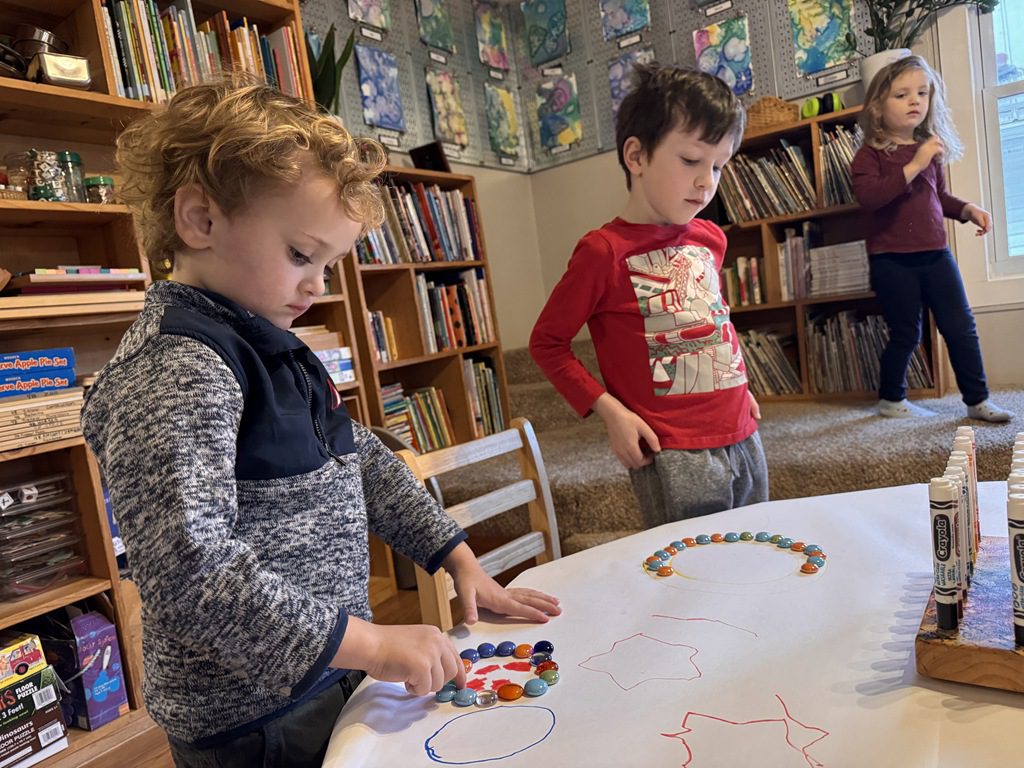 Today we worked on a group activity at the round table.  We used stencils or drew shapes on our paper covered table.  Then we used beads to create patterns, or follow the lines.  We worked on our counting skills as we went.  A few kids got creative drawing fruit, then used the beads to fill in the colors.  They made a blueberry, strawberry and an orange.