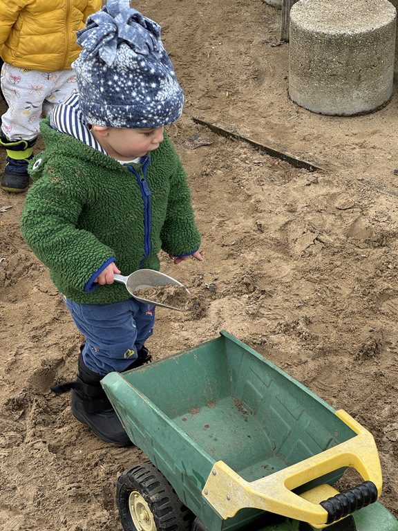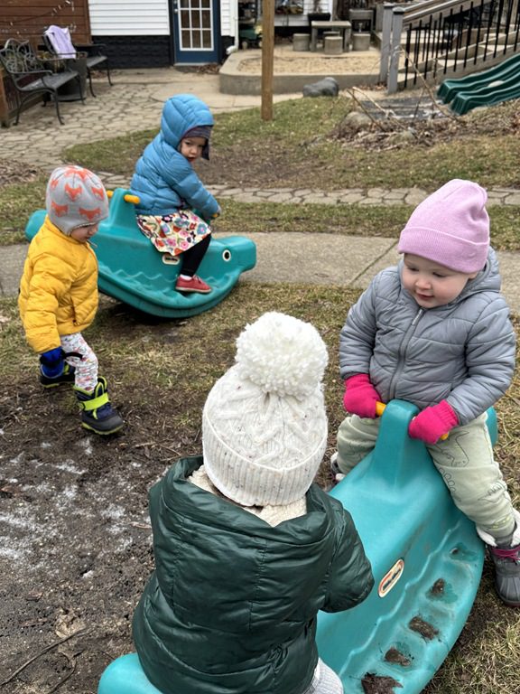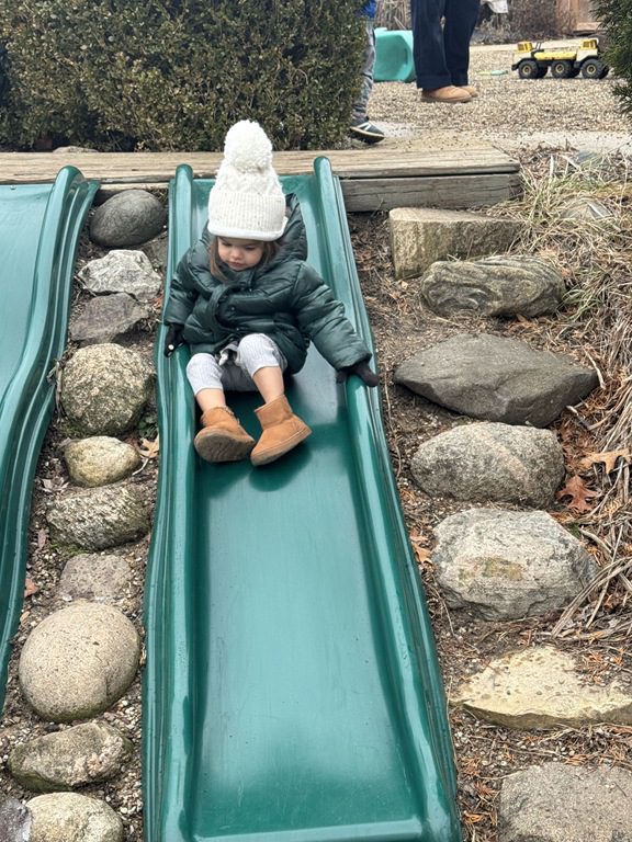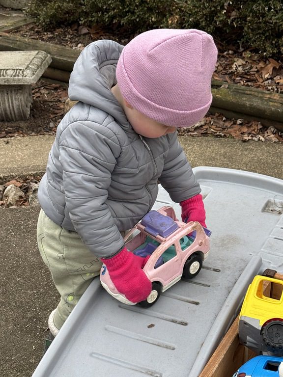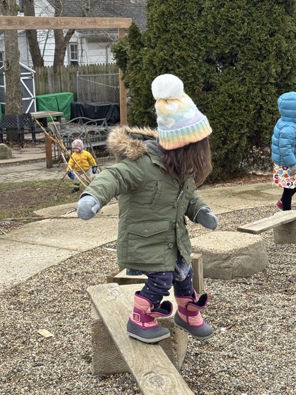 We then headed outside to get some fresh air and play.  We were busy riding on the teeter totter with a friend, working on our balance skills while walking on the balance beams, digging in the sandbox, driving cars down the ramps and going down the slide.