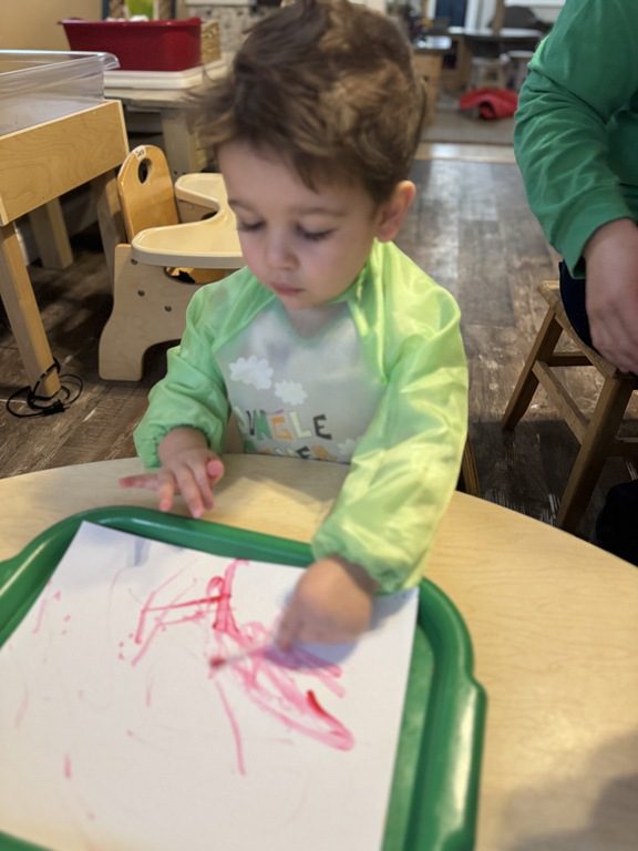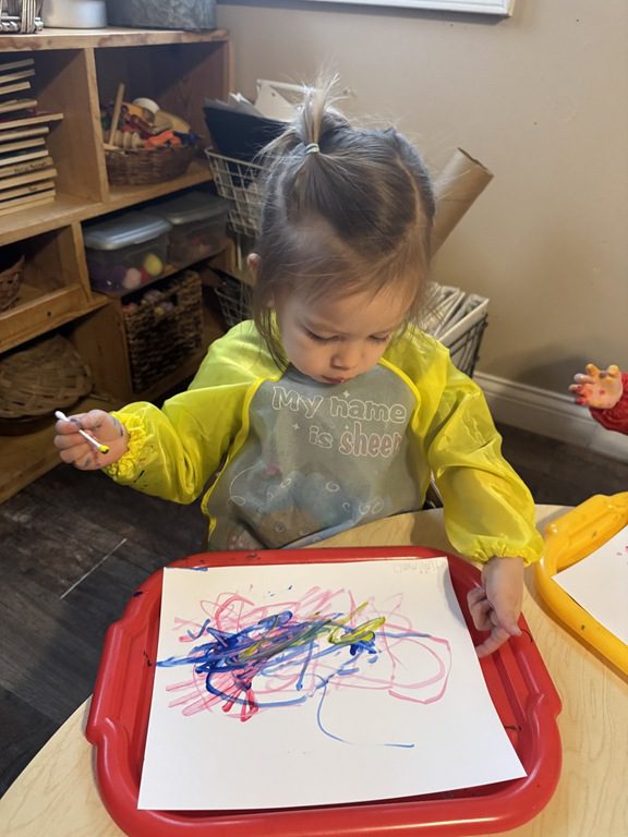 We then headed into the kitchen to paint with Q-tips.  We used blue, red and yellow tempera paint. We mixed our colors together to create new colors onto our papers.