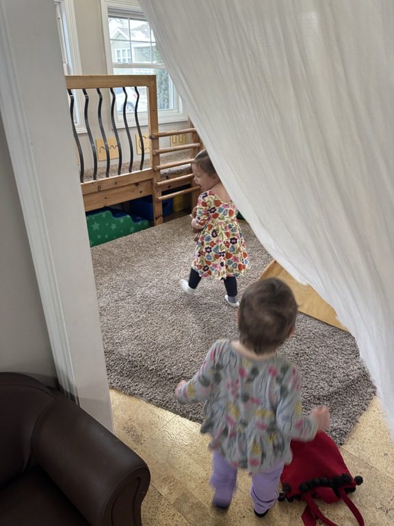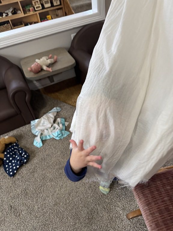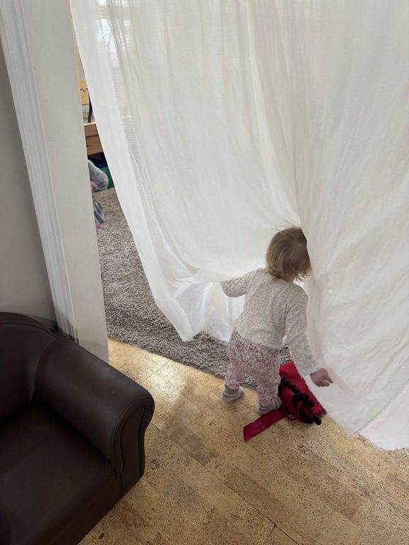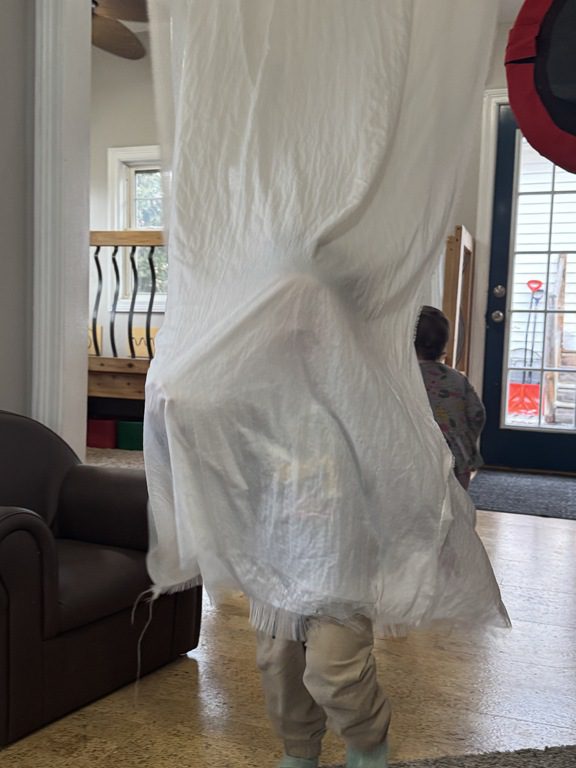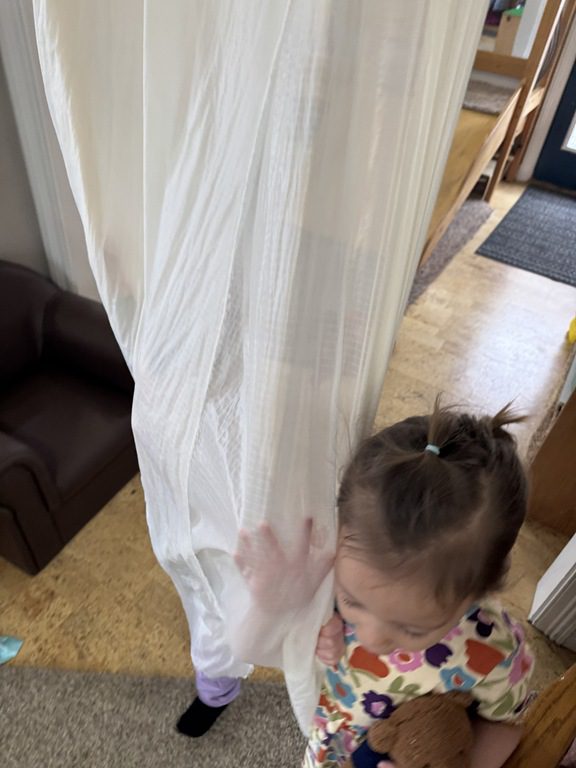 This morning we brought down the sheer curtain to run/walk through!  We had lots of laughs as we went through it to see our friends.