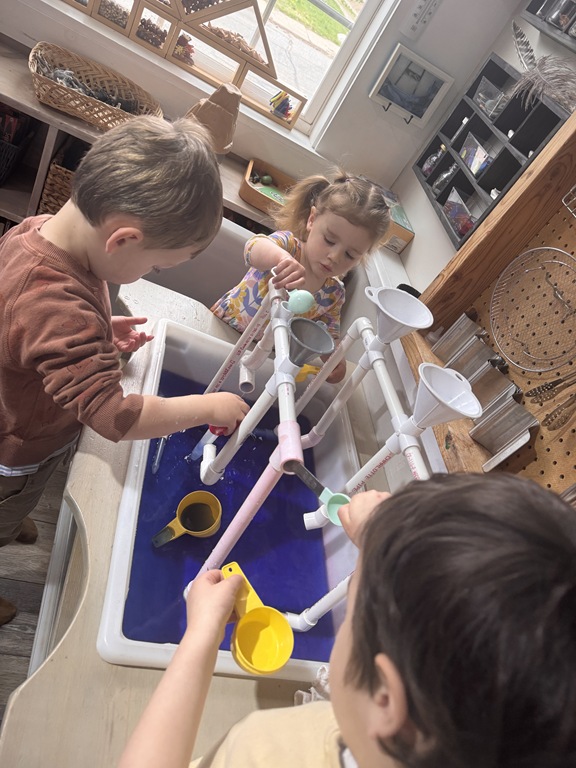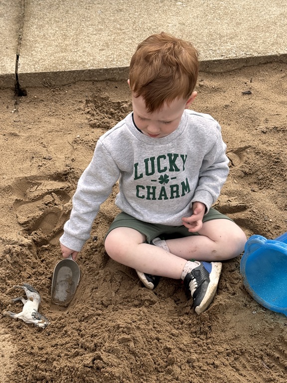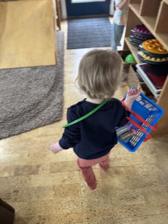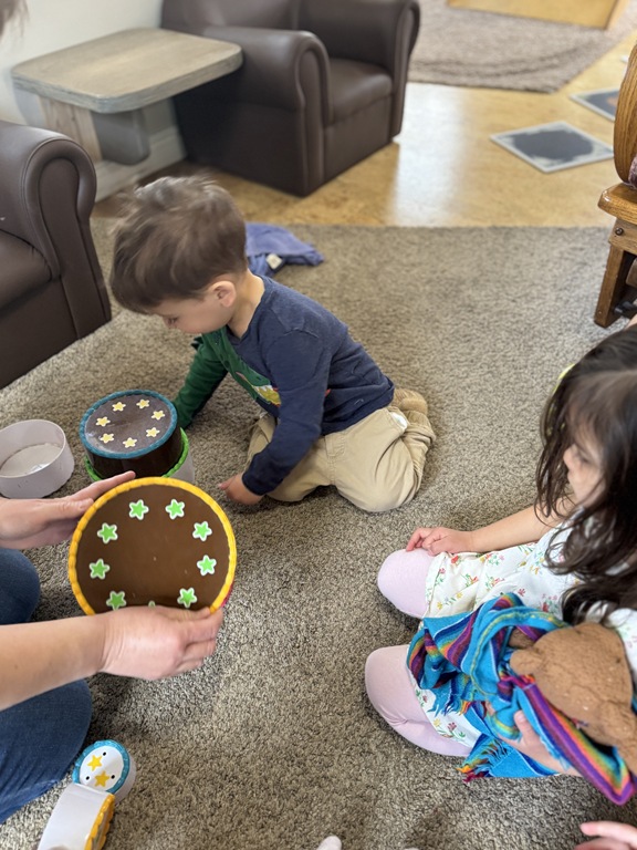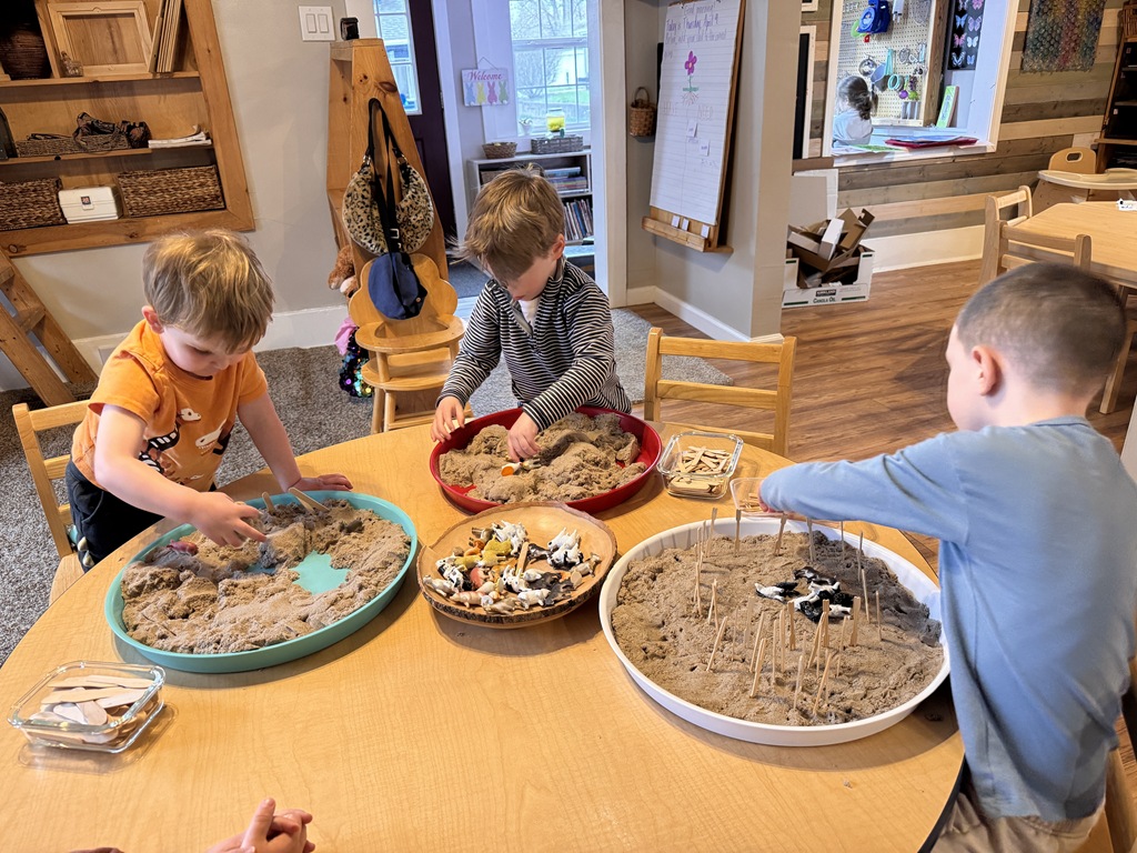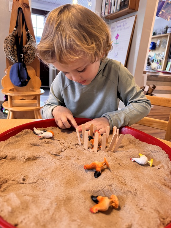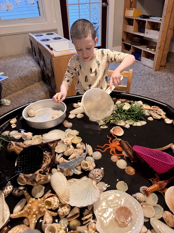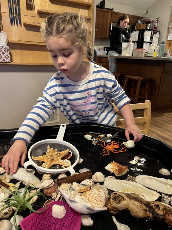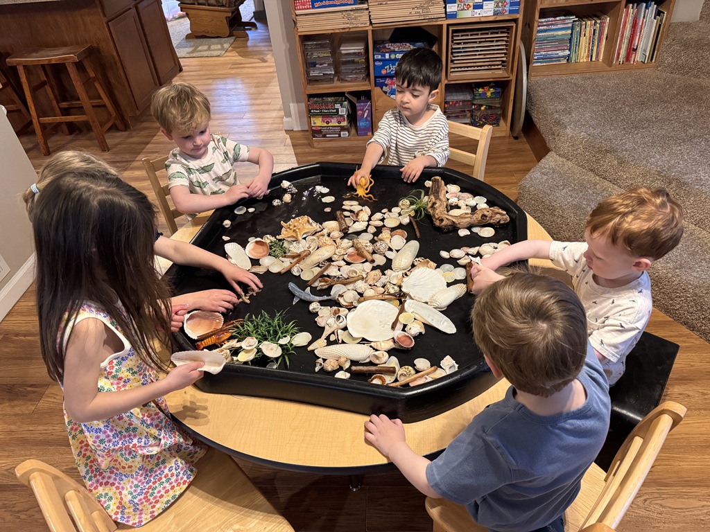 This morning, we offered an imaginative play activity for kids to explore ocean animals. Kids used shells to build boats, islands, and houses. Others collected shells with nets. Kids tried noticing which shells were alike and grouping them as they played. We also talked about how shells are actually made by animals even though many kids viewed them as plants.