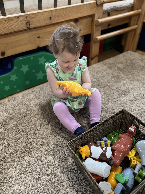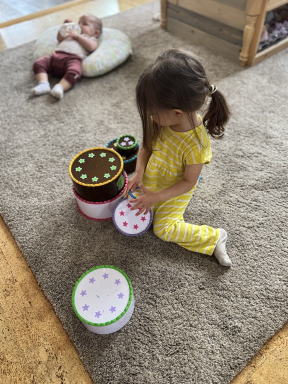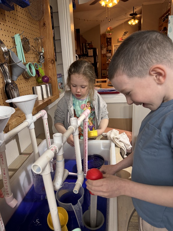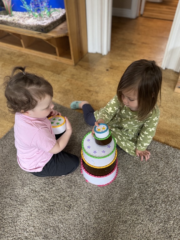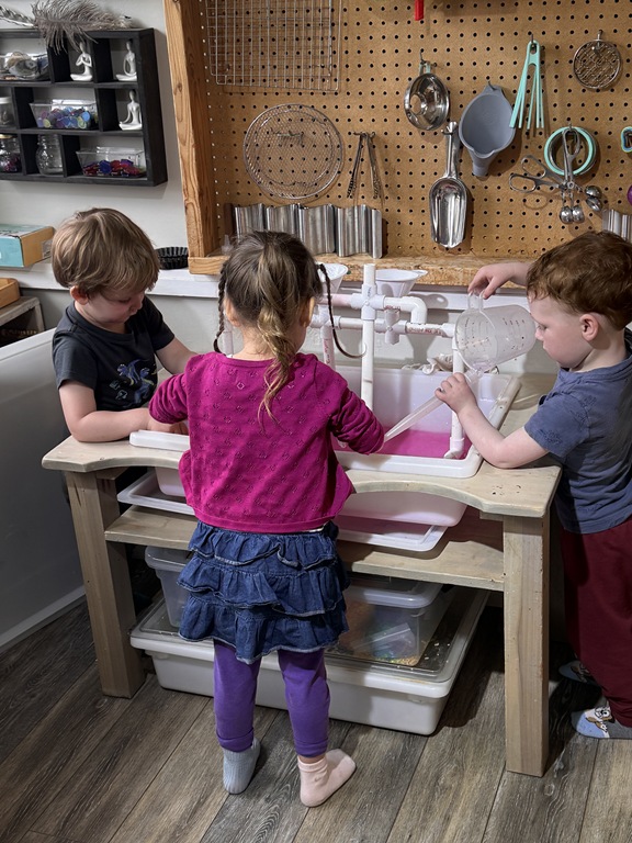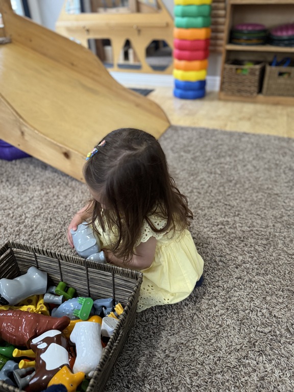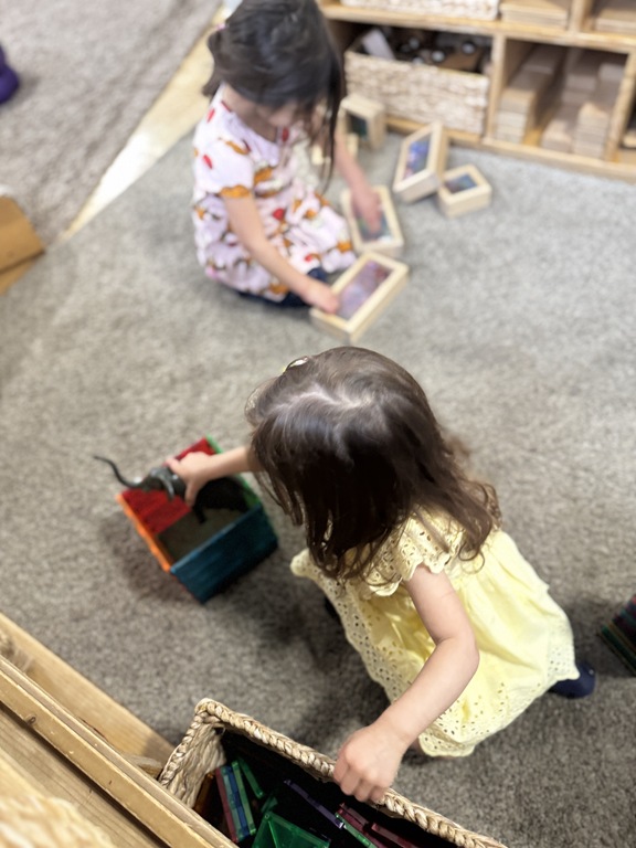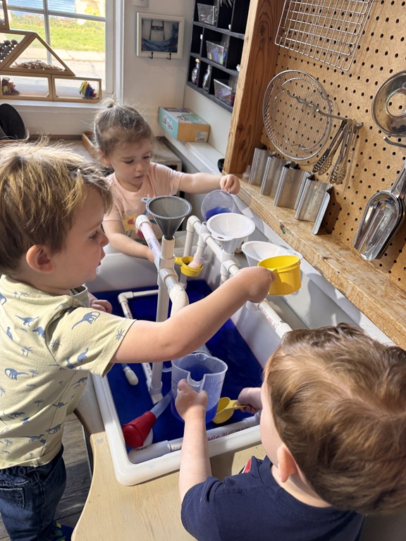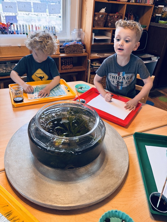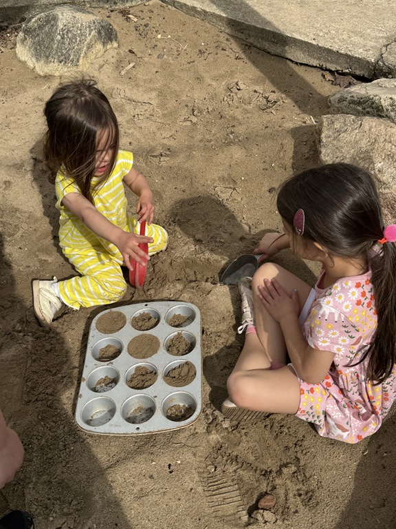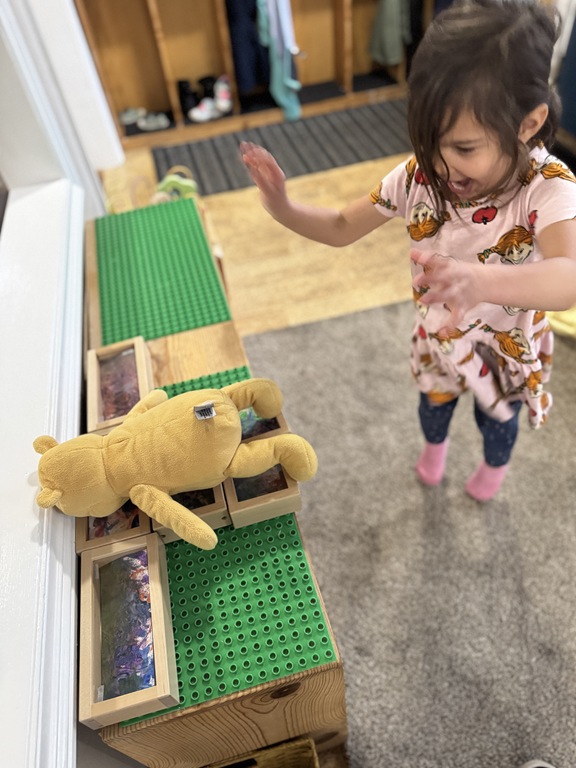 This morning, we offered an imaginative play activity for kids to explore ocean animals. Kids used shells to build boats, islands, and houses. Others collected shells with nets. Kids tried noticing which shells were alike and grouping them as they played. We also talked about how shells are actually made by animals even though many kids viewed them as plants.