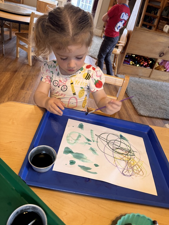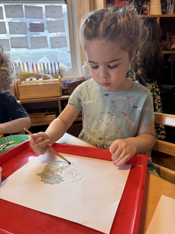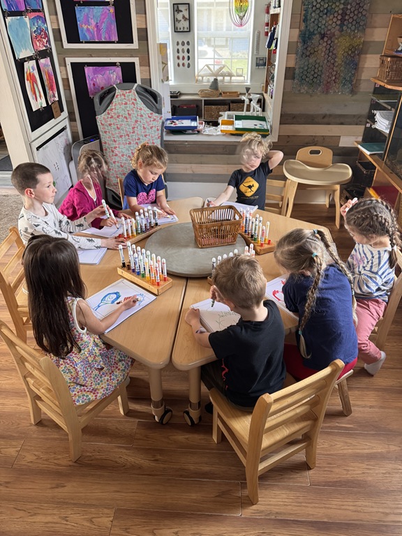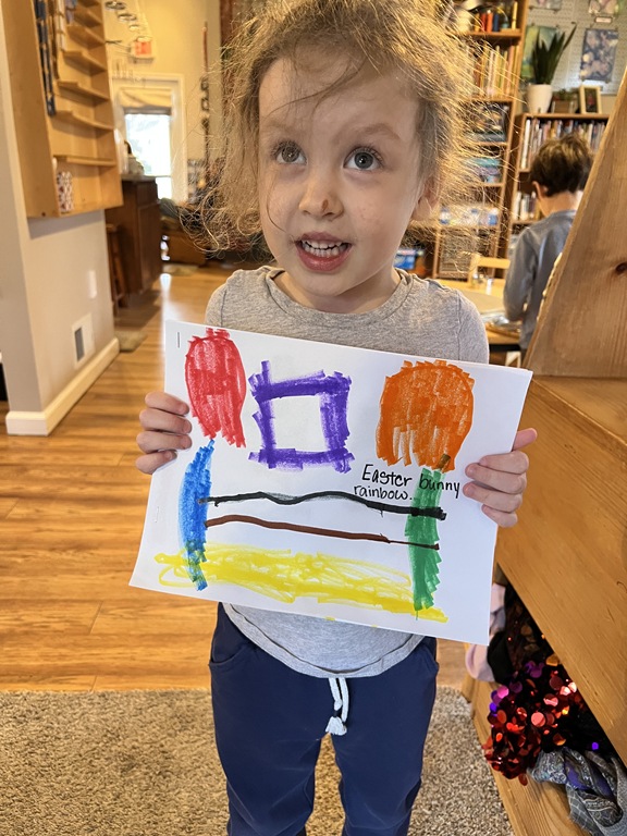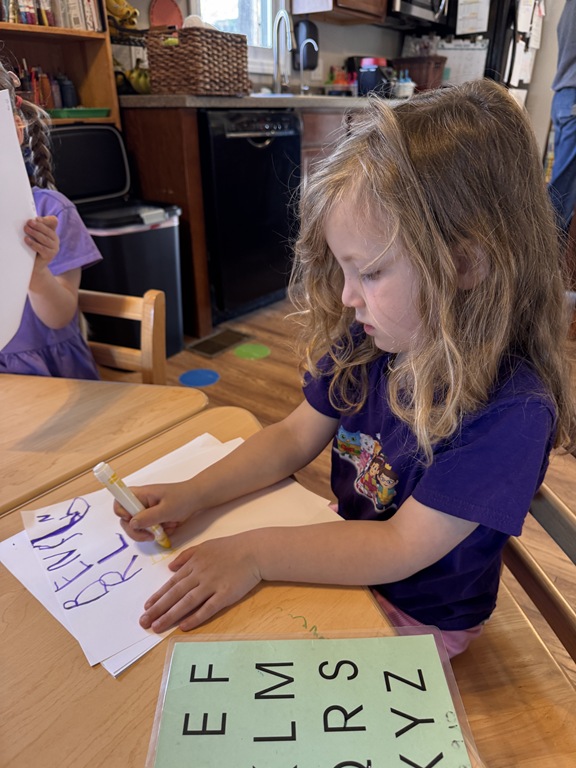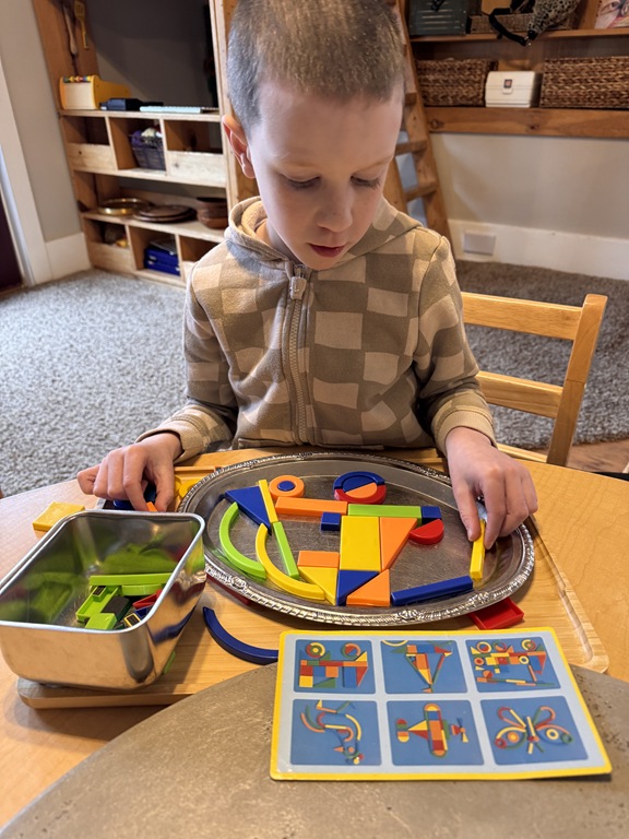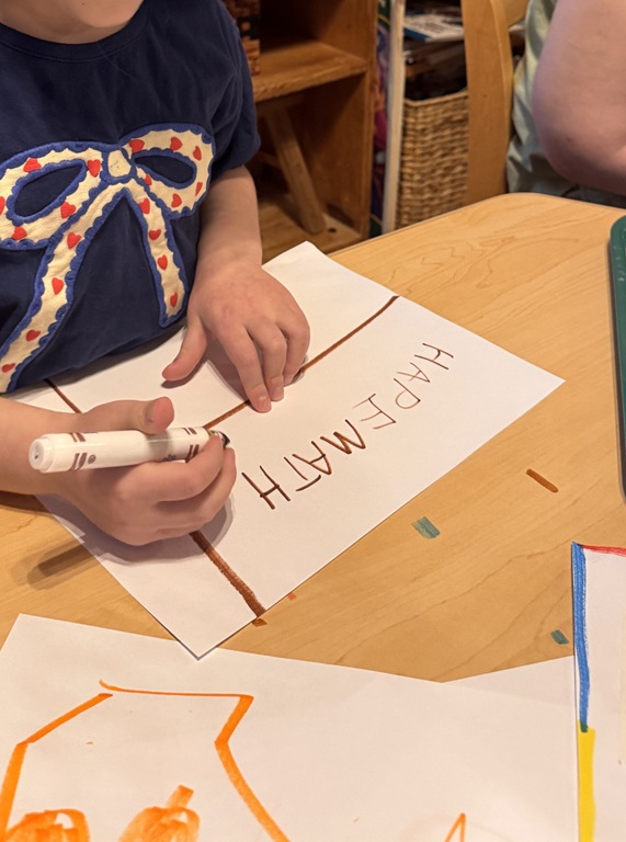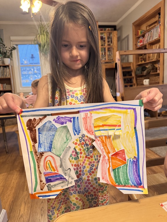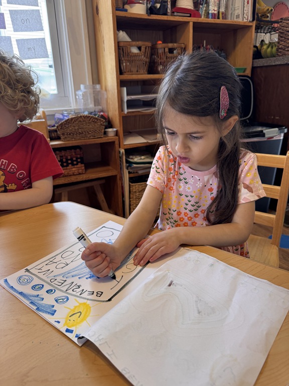Kids were hard a work on many independent projects in the art center. Some kids worked on spelling and writing while others created interesting shape collages.