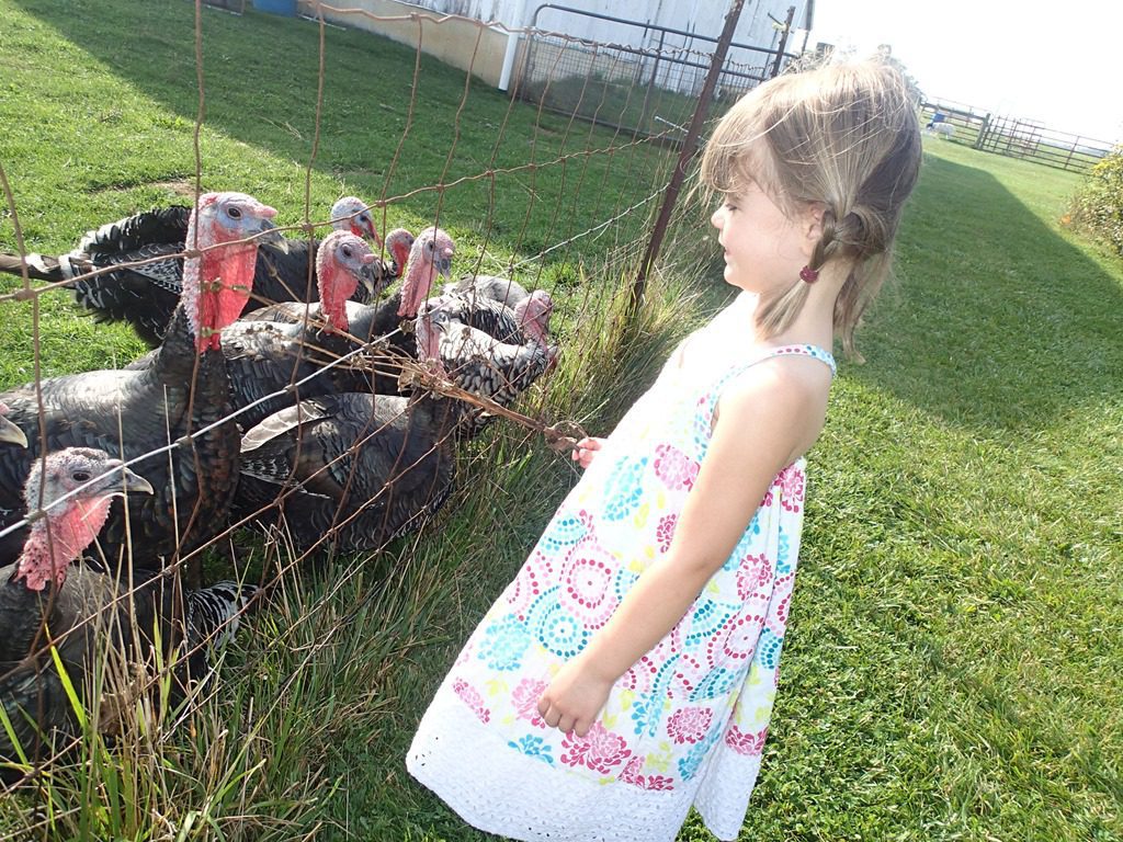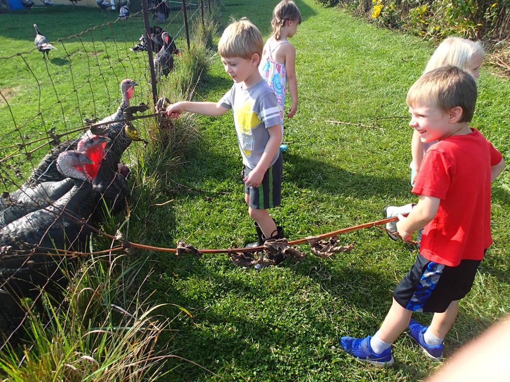 Before we headed back to the wooded area, we stopped to give the turkeys a snack. They sure do have a strong pecking nature about them!