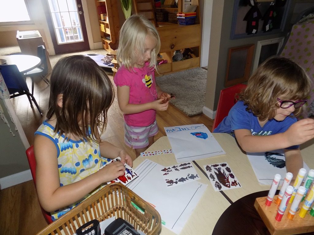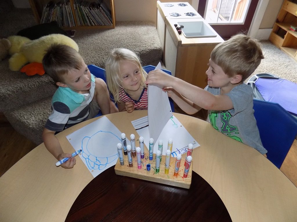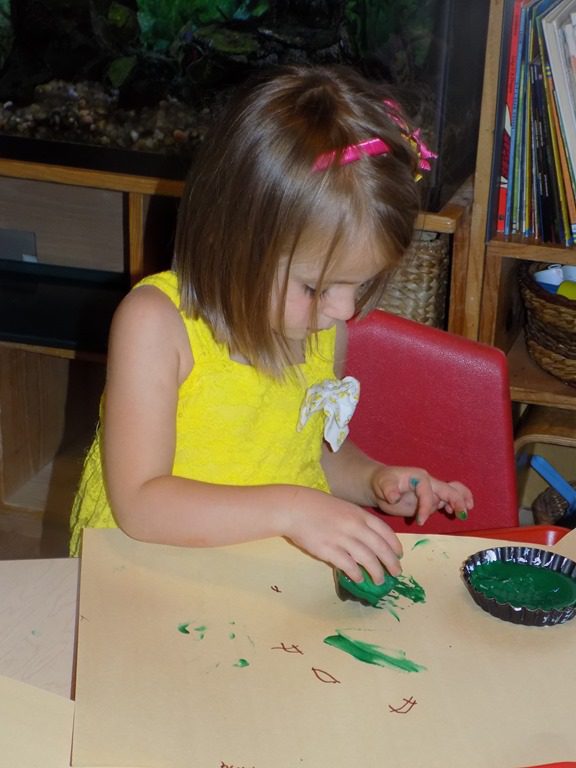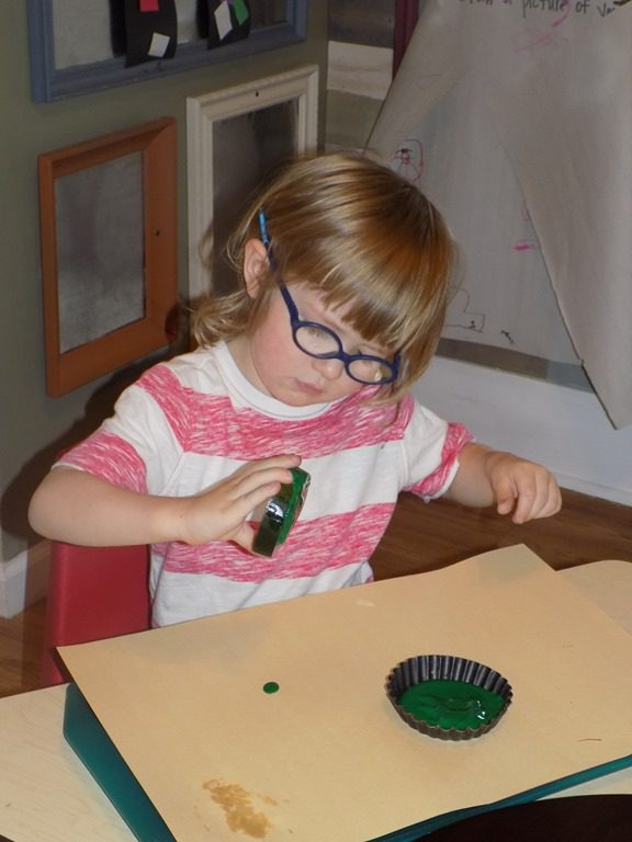 Children were invited to the art table this morning to paint with a vegetable that we picked from our garden; an overgrown zucchini! Miss Melinda cut the zucchini into circles and friends picked the color of paint they wanted to paint with!