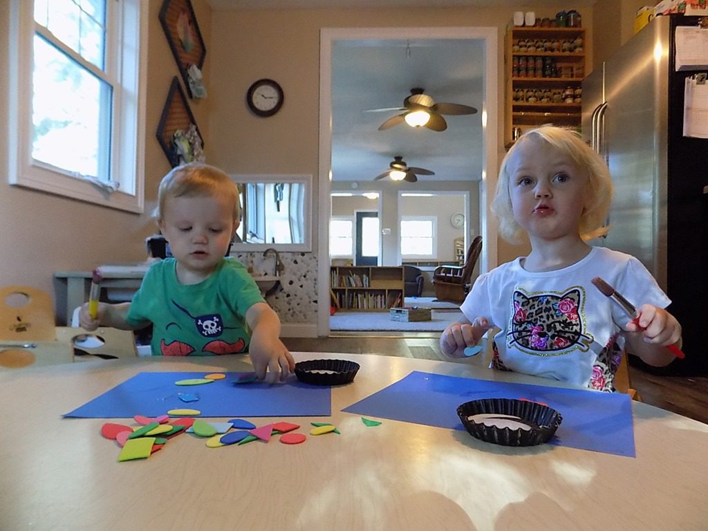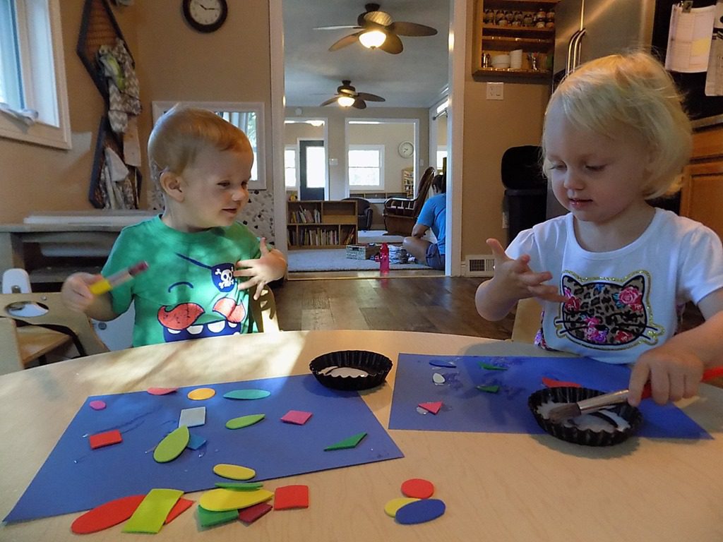 Sophia and Mack made colorful collages today. Their favorite part was spreading the glue with a paint brush. They laughed together over how sticky their fingers became after touching the glue!