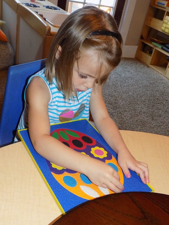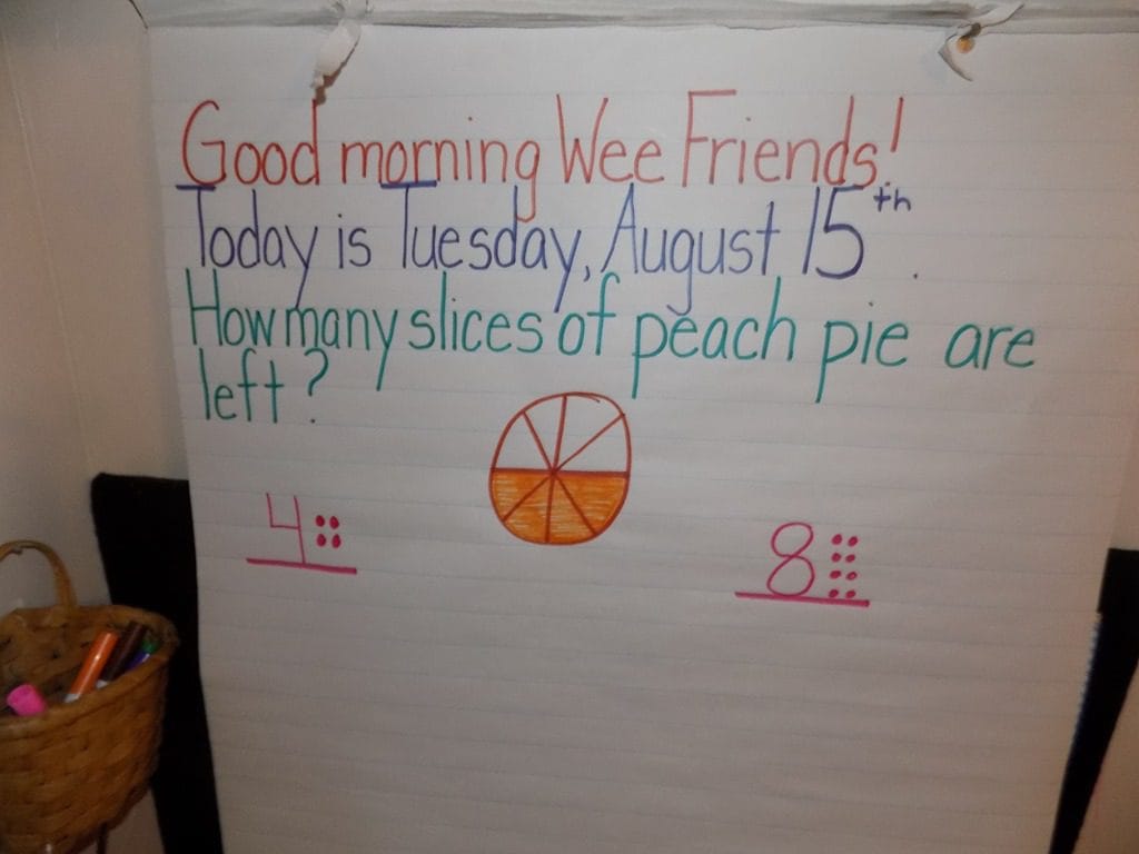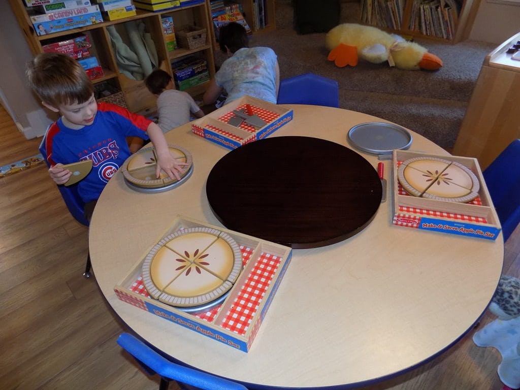 This mornings table activity went along with the message on the message board. We put out the apple pie sets and the children were able to work on some math skills. The children  could take pieces of pie away to see how many pieces they had left in their pie.