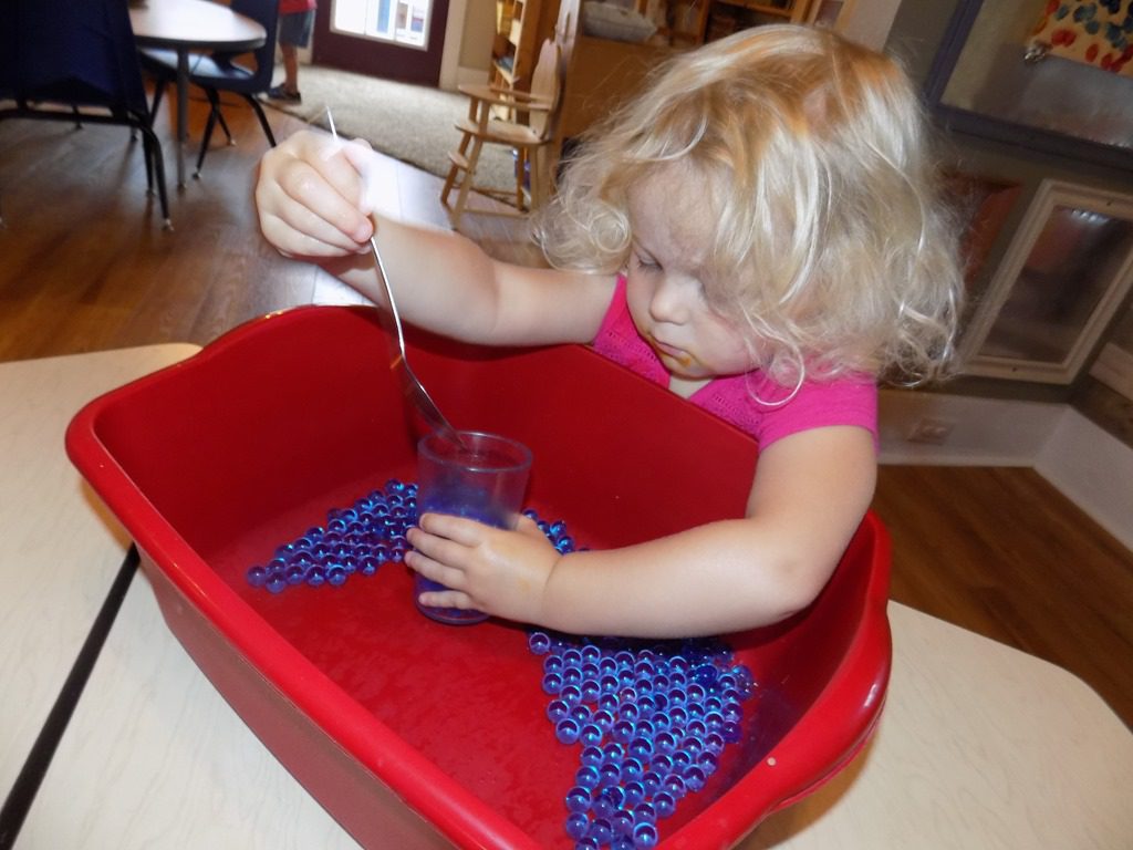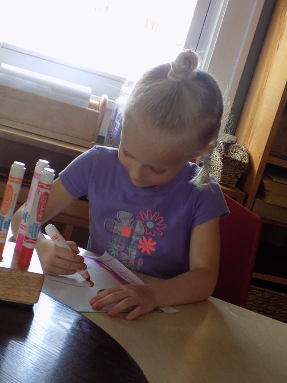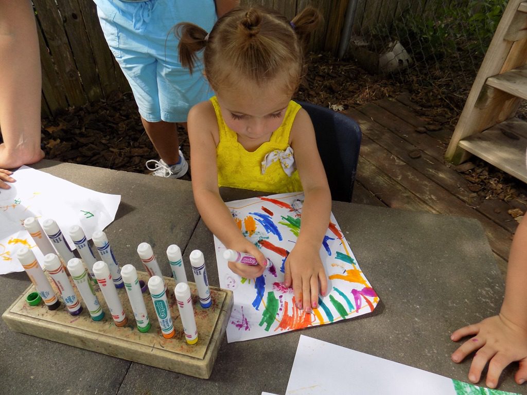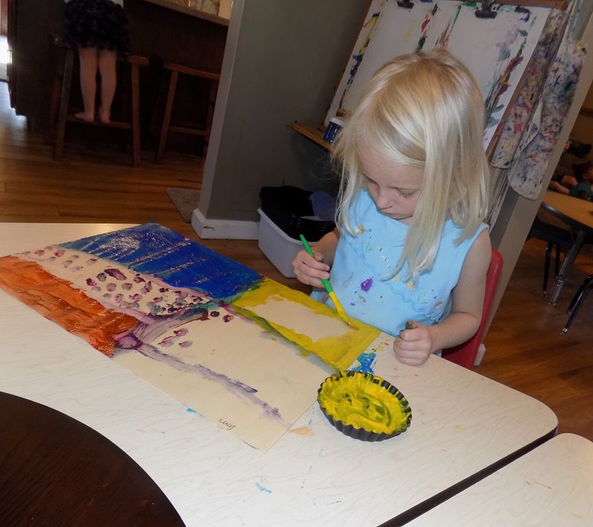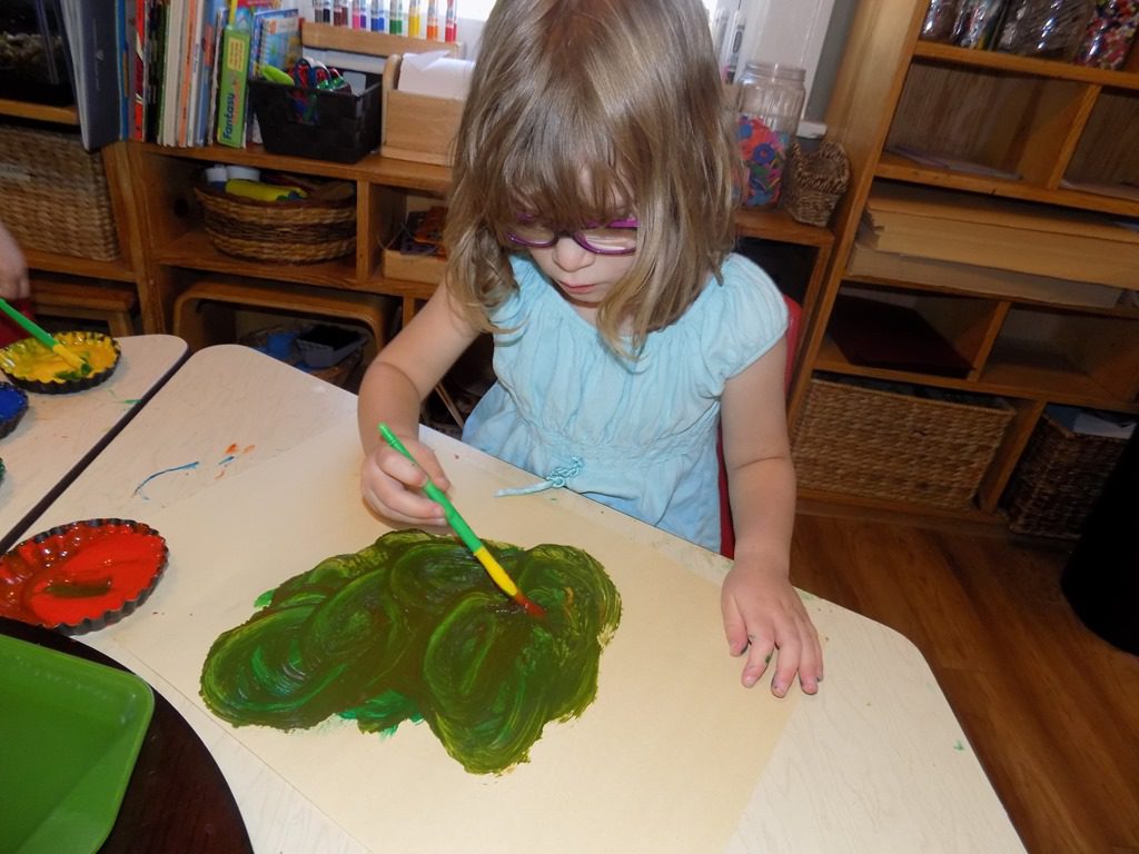 Our older friends took this opportunity to paint a picture and do an experiment; mixing the colors! When Maddie got to the table and saw the colors available, she said aloud, “I wonder what color I could make if I mixed all of the colors together?!”—So, she completed her thought! After mixing all of the colors together, she shouted, “I made brown!”