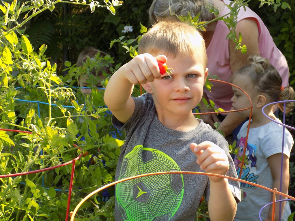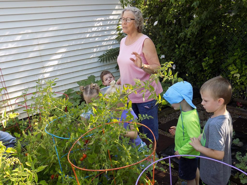 Our garden was bursting with vegetables that were ready to pick. Miss Melinda held a bowl while children picked tomatoes that were red which meant they were ready to eat!