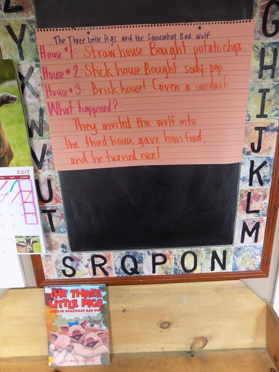 In large group, we read ‘The Three Little Pigs and the Somewhat Bad Wolf’. We read the story and afterwards, we went through and discussed specific events that took place. We documented what each house was made of. In this version of the story, all three pigs got money from the farmer who up and left town so they had to find a new place to live.