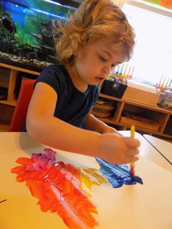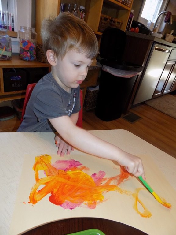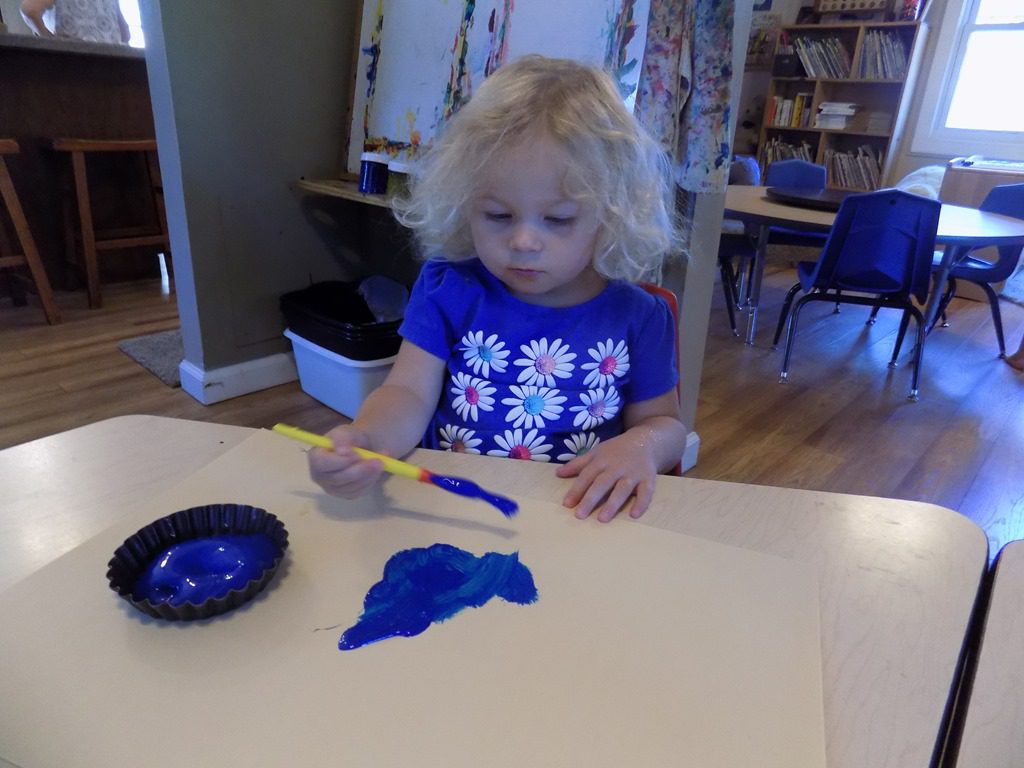 Children were invited to the art table today to partake in a process art experience. Paper, paint, and paintbrushes were made available along with no guidelines. It’s an experience that any friend can do no matter their age. We had many friends come to the table this morning while a few chose not to which is perfectly OKAY! Sometimes, children don’t want to leave what they’ve been working on; why would we want to interrupt that?!