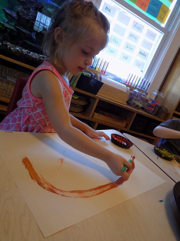Our younger friends experimented with the paint brush on their paper. Four of the colors were regular tempera paint while one of the paints available was a thicker paint that was glittery. This was interesting for friends as they experimented with it.