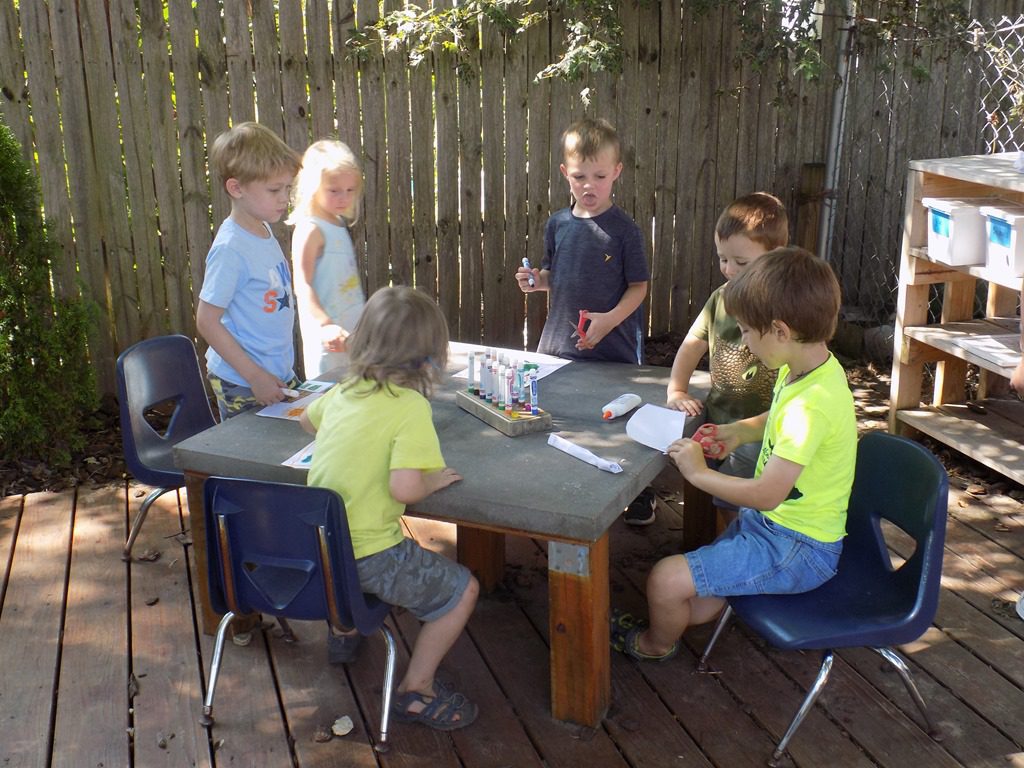 The rest of our morning consisted of fresh (and warm) air as we moved throughout the yard. The art table became a busy place towards the end of our time outside where children used glue, stencils, and scissors to create.